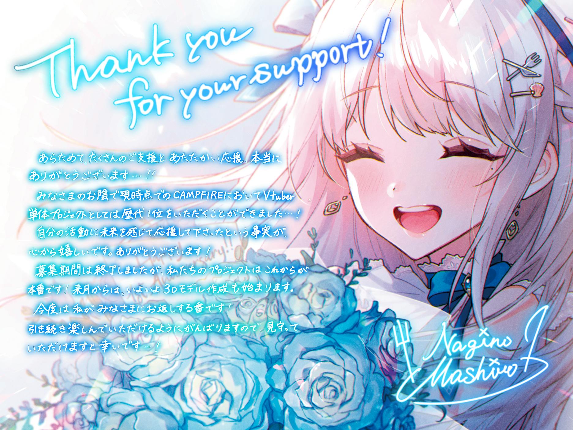 プロジェクト終了後に取り急ぎLIVE2Dの姿でお礼動画を、お披露目動画公開後にみなさまのお力で実現した3Dの姿でのお礼動画をお送りいたします。