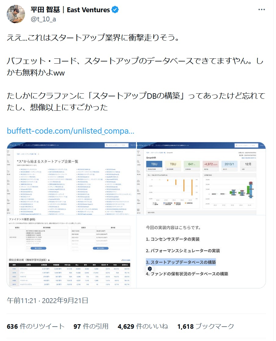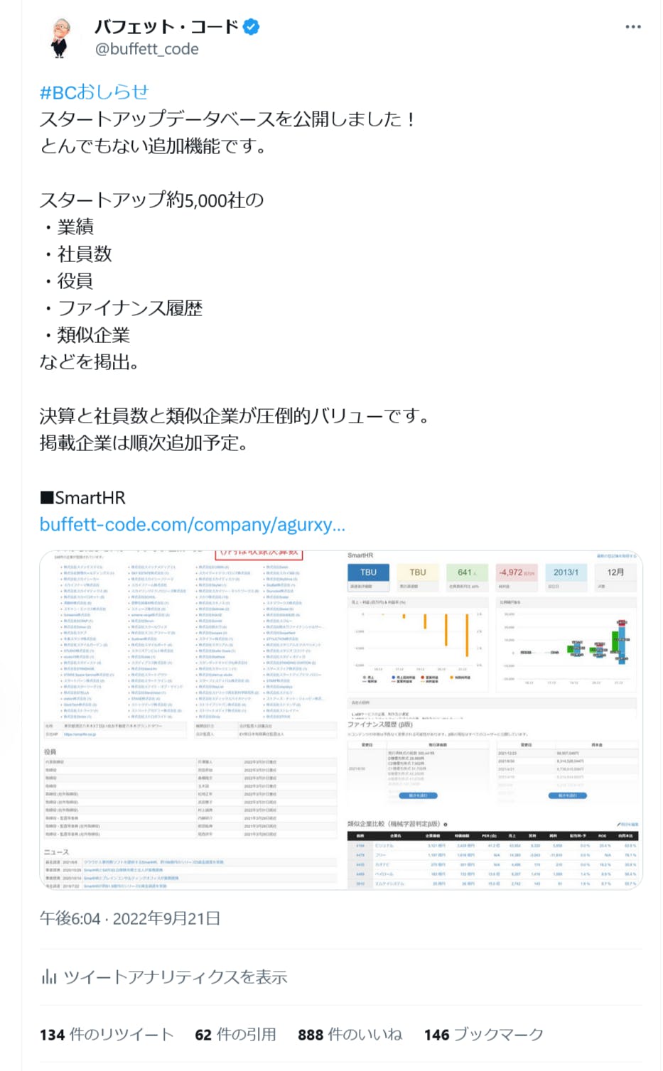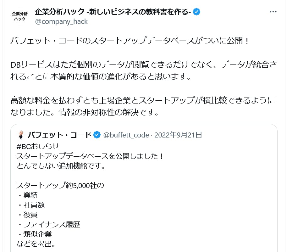 バフェット・コードでは、昨年(2022年)の夏にスタートアップデータベースを公開しました。
