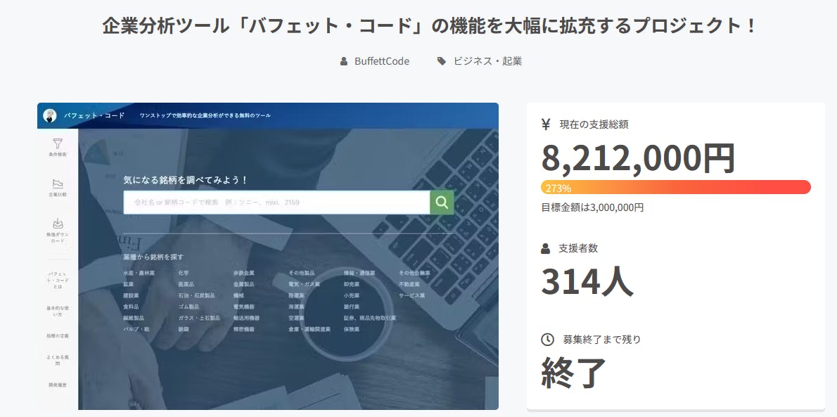 2023/07/31 09:07皆様、いつもご愛顧ありがとうございます。バフェット・コードの運営です。7月14日から開始したクラウドファンディングは、もうご覧いただけましたでしょうか。すでにご支援いただいた皆様には心から感謝申し上げます。7/29に目標金額を達成いたしまして、本日が最終日となっております。ご支援いただいた方へのリターンとして、ライトプランやスタンダードプランのチケットを特別価格でご提供しております。有料機能をご検討中の方は、このお得な機会にぜひご支援をお願いいたします。【ご支援はこちらから】https://camp-fire.jp/projects/view/682784■今回のクラウドファンディングのポイント今回のクラウドファンディングでは、企業分析には欠かせない3つの大きな機能を実装することになっています。①過去10年分のM&Aの案件検索過去10年分、計5,000件のM&Aの詳細な情報を検索・閲覧することができるようになります。誰が、誰を、誰から、いくらで、なぜ購入したのか、についての情報を入手することができます。②未上場企業データベースの拡充未上場企業の収録企業を5,000社から一気に15万社まで拡張します。社名や住所や代表者名のみならず、業績の収録がある15万社になります。企業分析や、M&Aの案件発掘、営業にお役立てください。③米国上場企業の決算書の日本語訳米国上場企業の決算書(10-Q、10-K)を日本語訳します。日本語の決算書と同じようにすらすらと米国決算書を読めるようになり、情報取得の速度と強度が段違いに上がります。変化の激しい業界動向やマーケットにおいて、企業情報の重要性は増すばかりです。そんな企業情報を潤沢に利用することができるスタンダードプランがなんと定価の半額以下でご利用いただけるチャンスです!今回のクラウドファンディングでのご支援を是非ご検討ください。【ご支援はこちらから】https://camp-fire.jp/projects/view/682784配信元:バフェット・コード運営 もっと見る