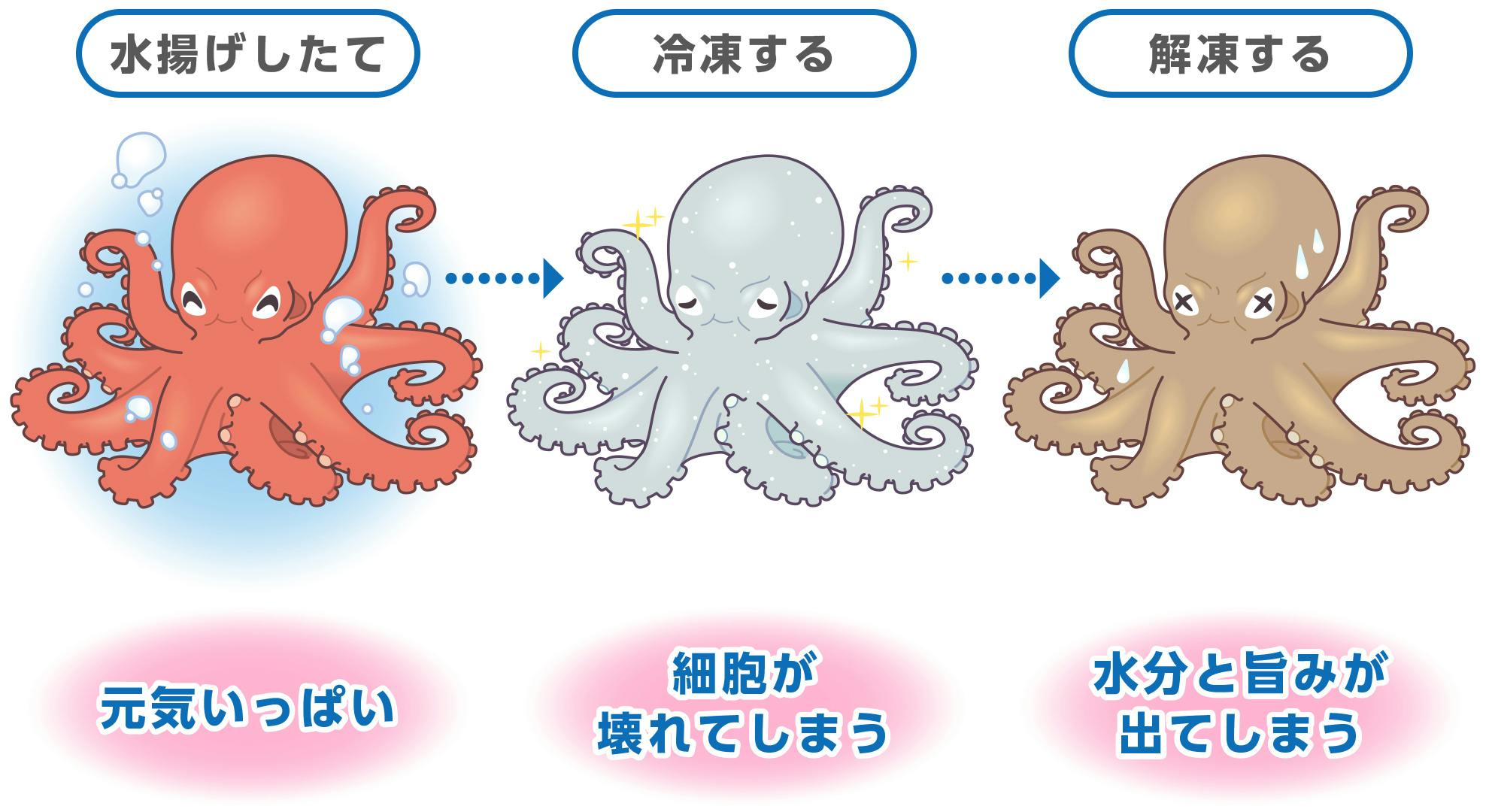 タコは水分を多く含んだ食材ですが、水分の多いタコを冷凍すると内部に強い圧力がかかりタコの細胞が壊れてしまいます。