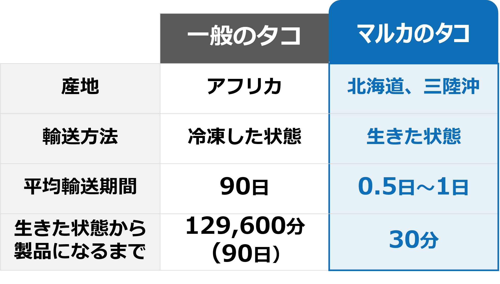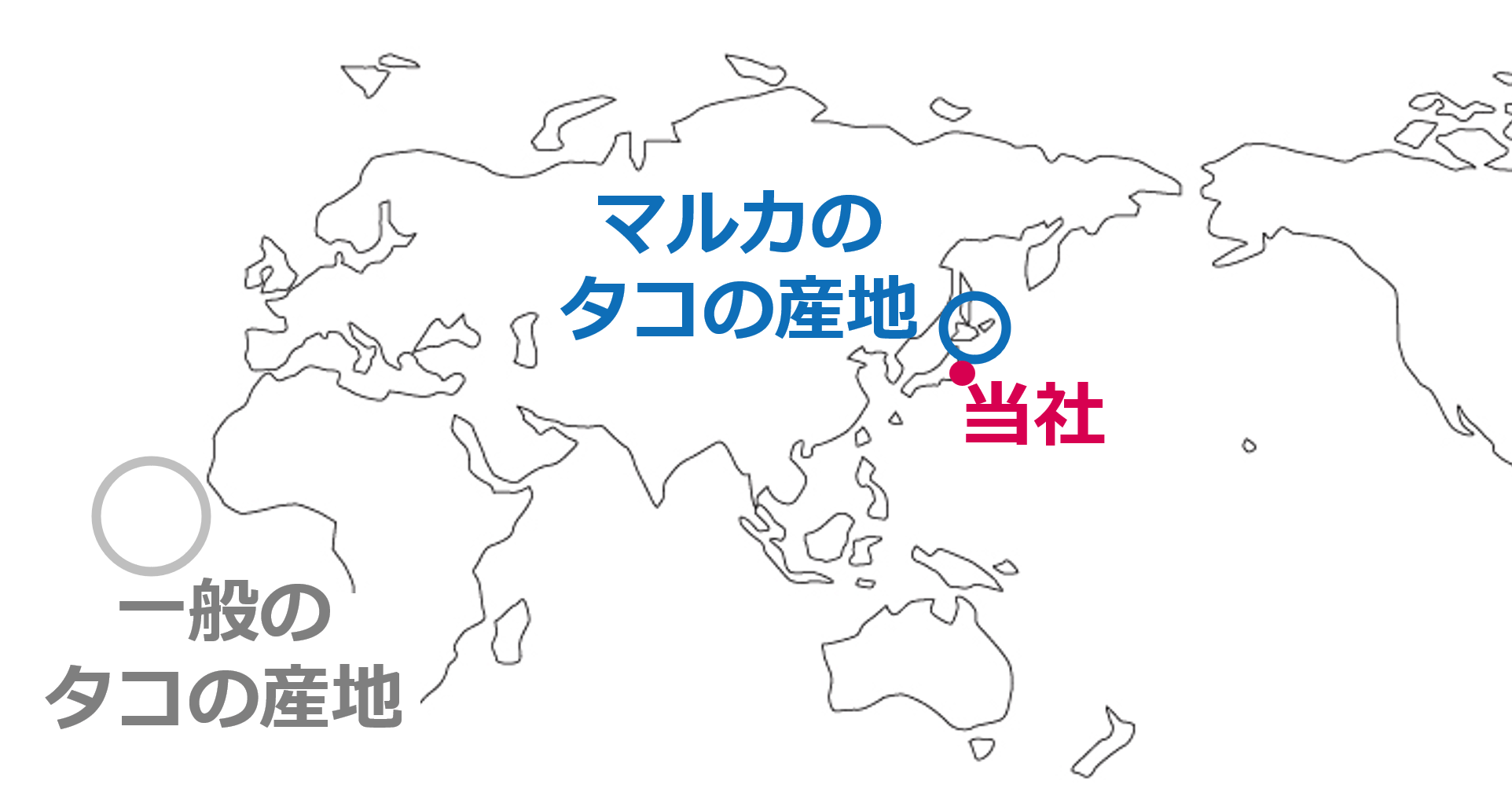 皆さんが目にすることの多い一般に流通しているタコは、アフリカ沖で水揚げした後、冷凍された状態で数ヶ月かけて日本に輸送されているため、鮮度が落ち、タコ本来の素材の良さがなくなってしまっていることが多いからです。