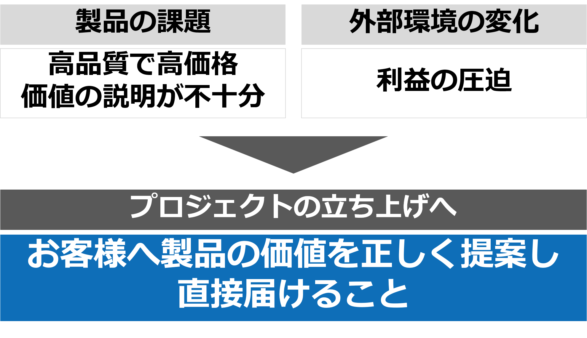 事業を継続するため課題の洗い出しと打ち手の議論を重ねた結果、今私たちが行うべきことは “お客様へ商品の価値を正しく提案し、直接届けること “ と考え、今回のプロジェクトの立ち上げを決断しました。