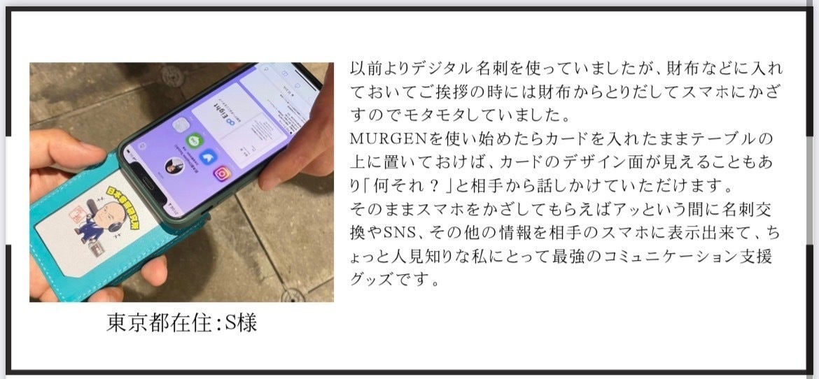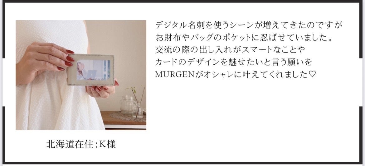 デジタル名刺を従来の名刺ケースに収めるのではなく、MURGENと共に持つことで単なるアイテム以上の意味合いを得られます。