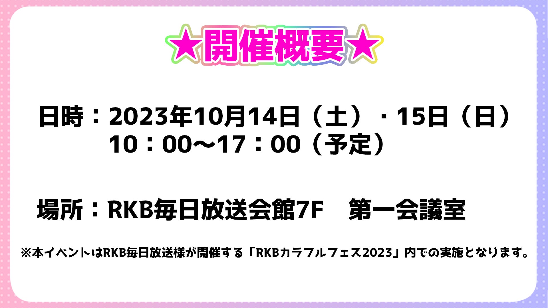 今年も昨年に引き続き、福岡で最もVTuberをとりあげている番組「エンタテ!区~テレビが知らないe世界~」を放送しているRKB毎日放送様協力のもと、RKBカラフルフェス2023内での開催となります!