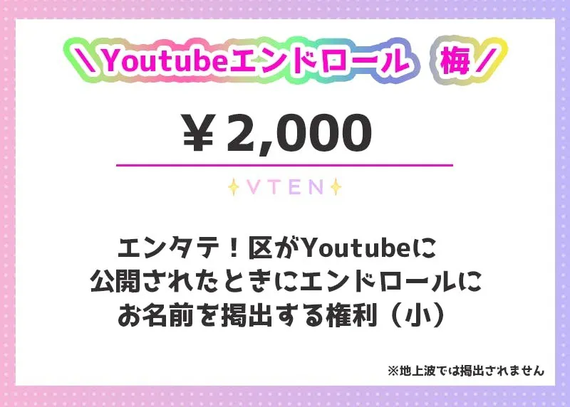 ストレッチゴールにてYoutube配信が決まったエンタテ!区のエンドロールにお名前を掲出する権利です。※地上波放送分には掲出されません。Youtube配信分にのみ掲出されます。