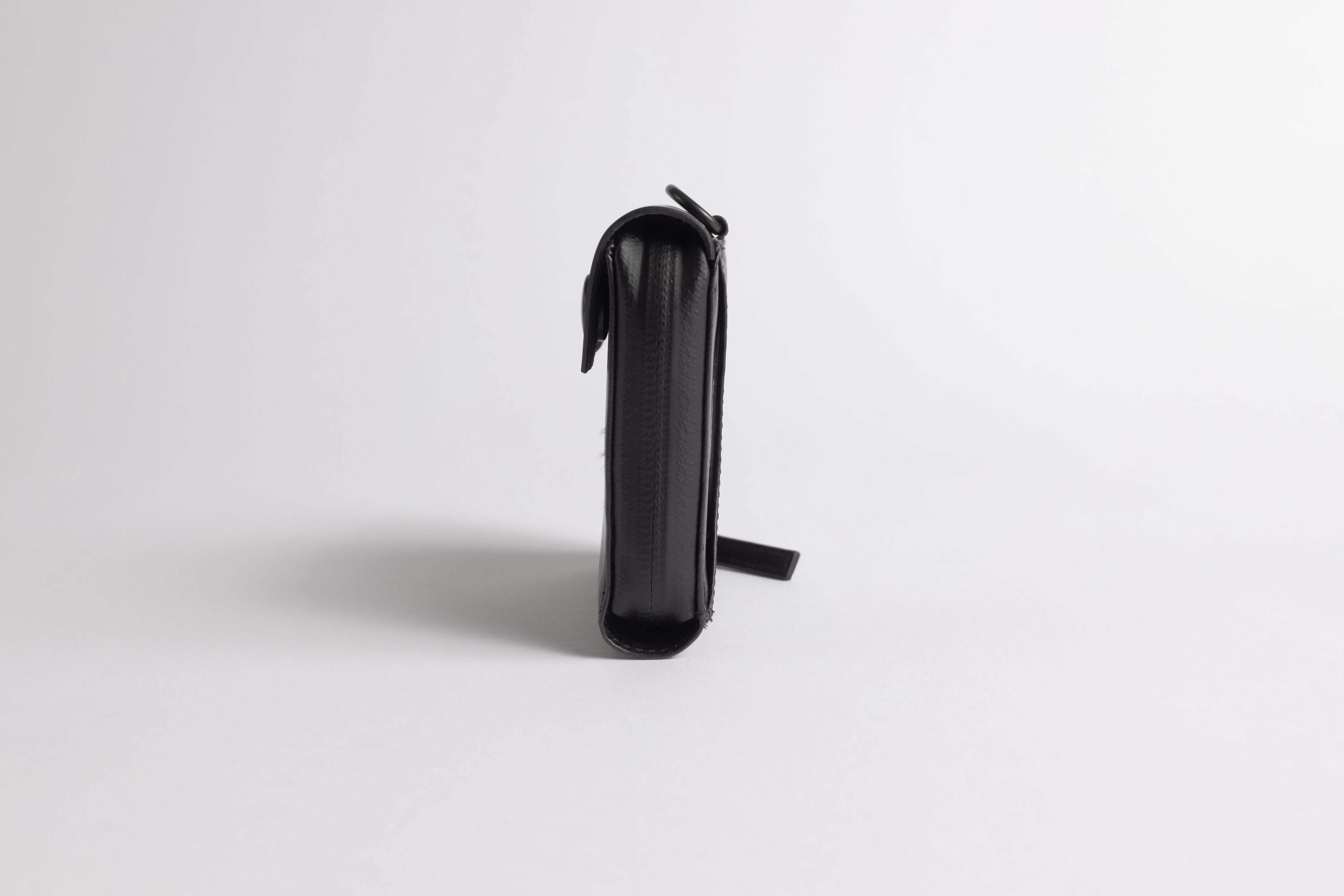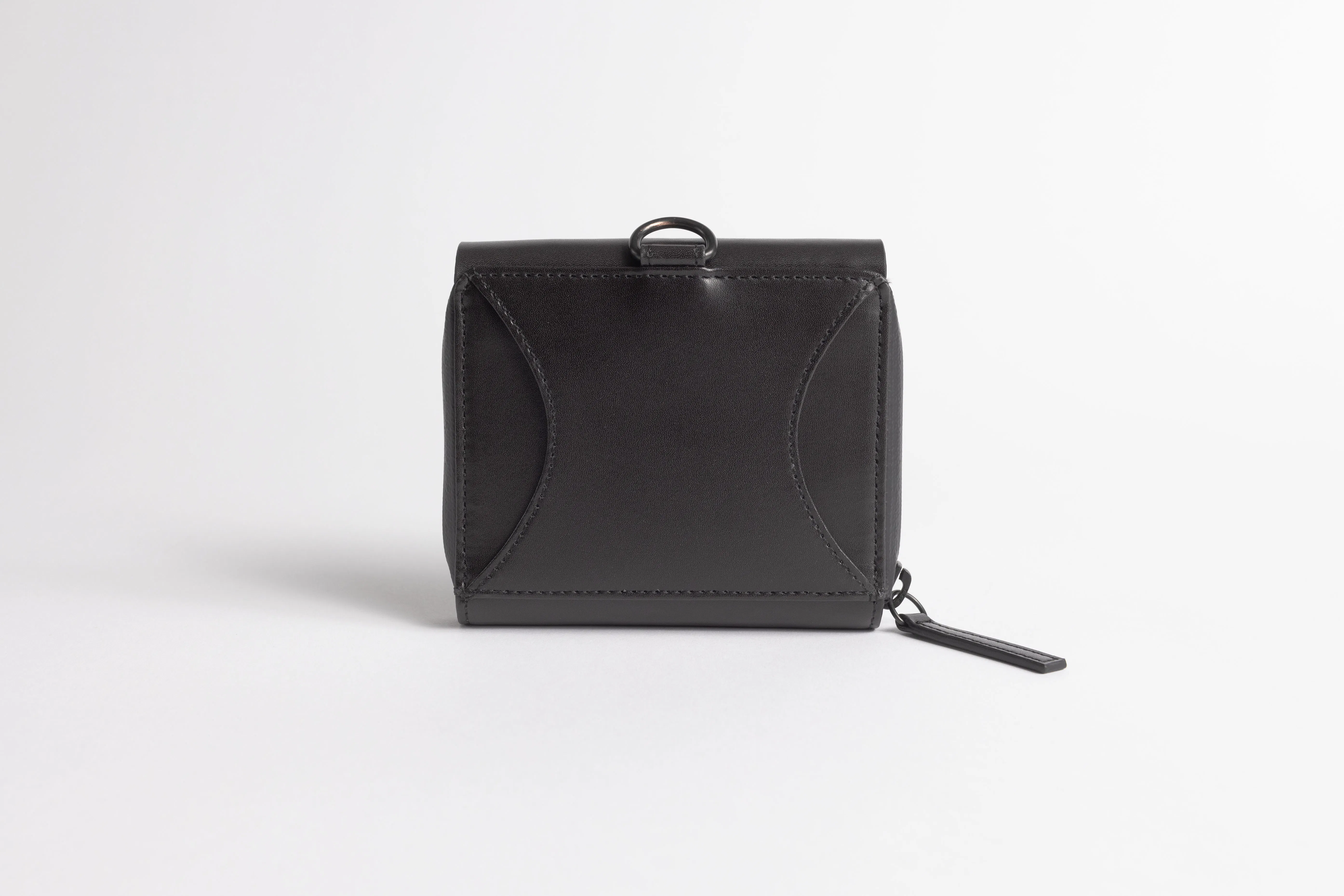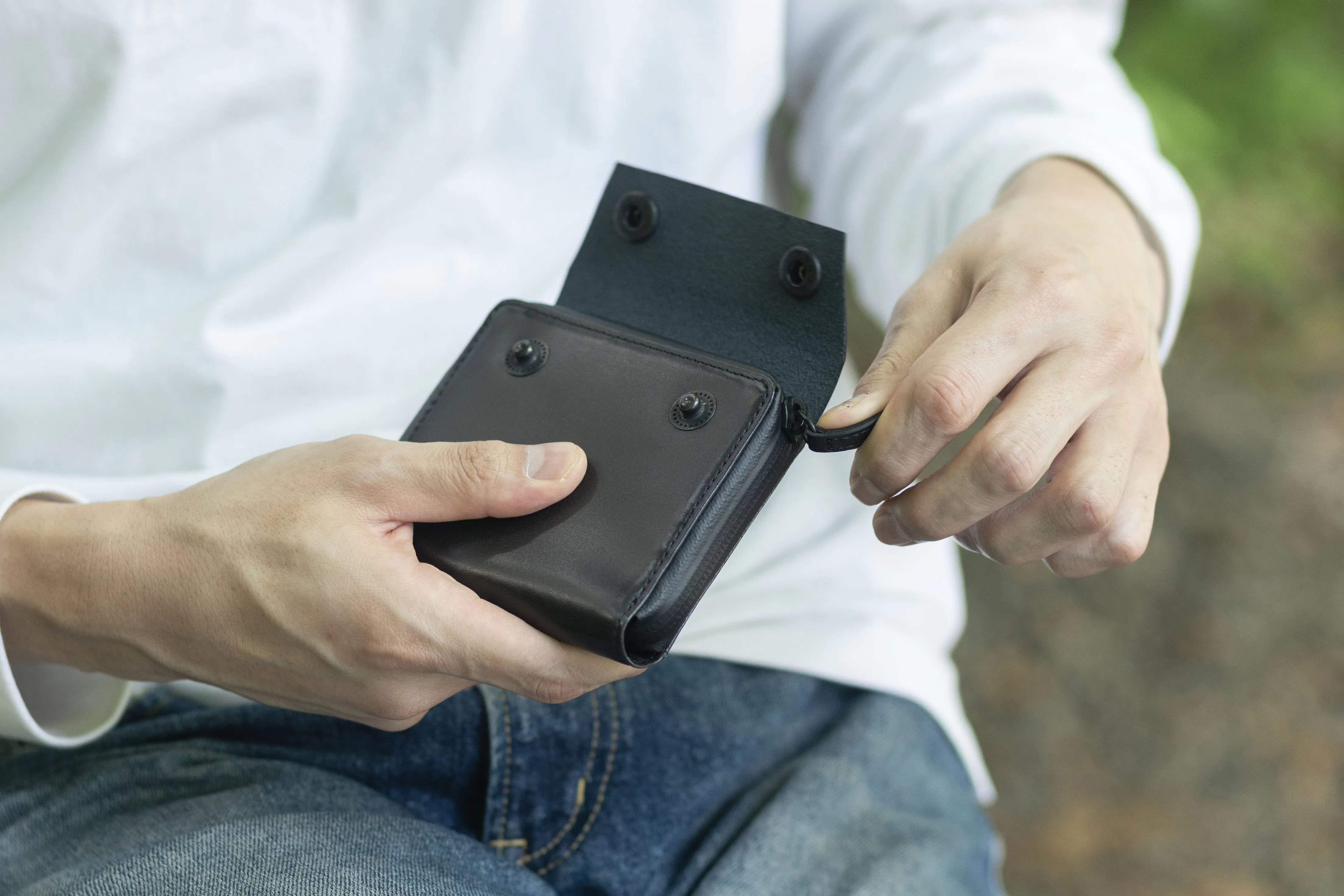 身に付けているとき、大切なお札や小銭を落とさないように、開口部はラウンドファスナーとバネホック付きのフラップで二重にガード。ホックはダルメッキ製で、味わい深い経年変化が楽しめます。