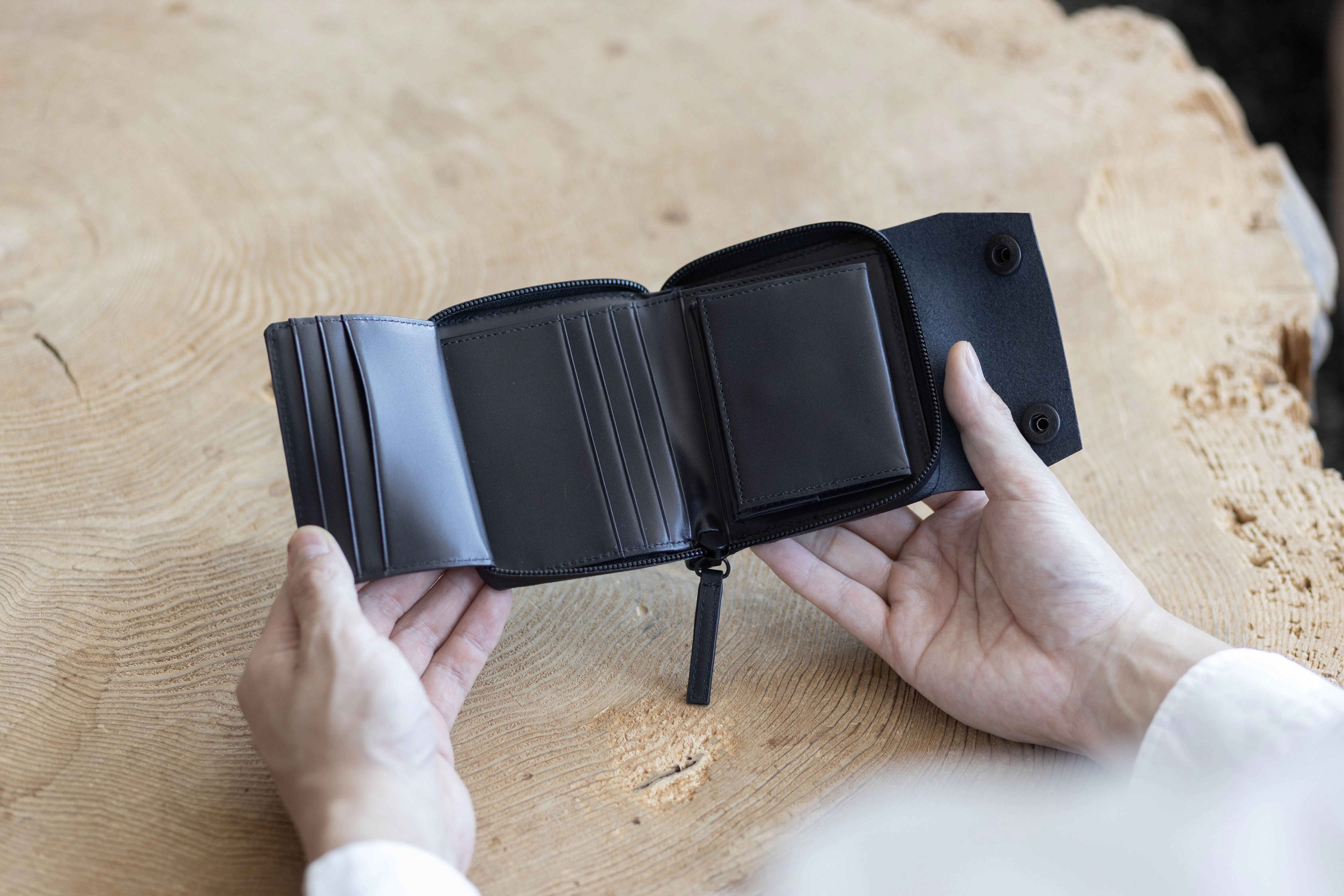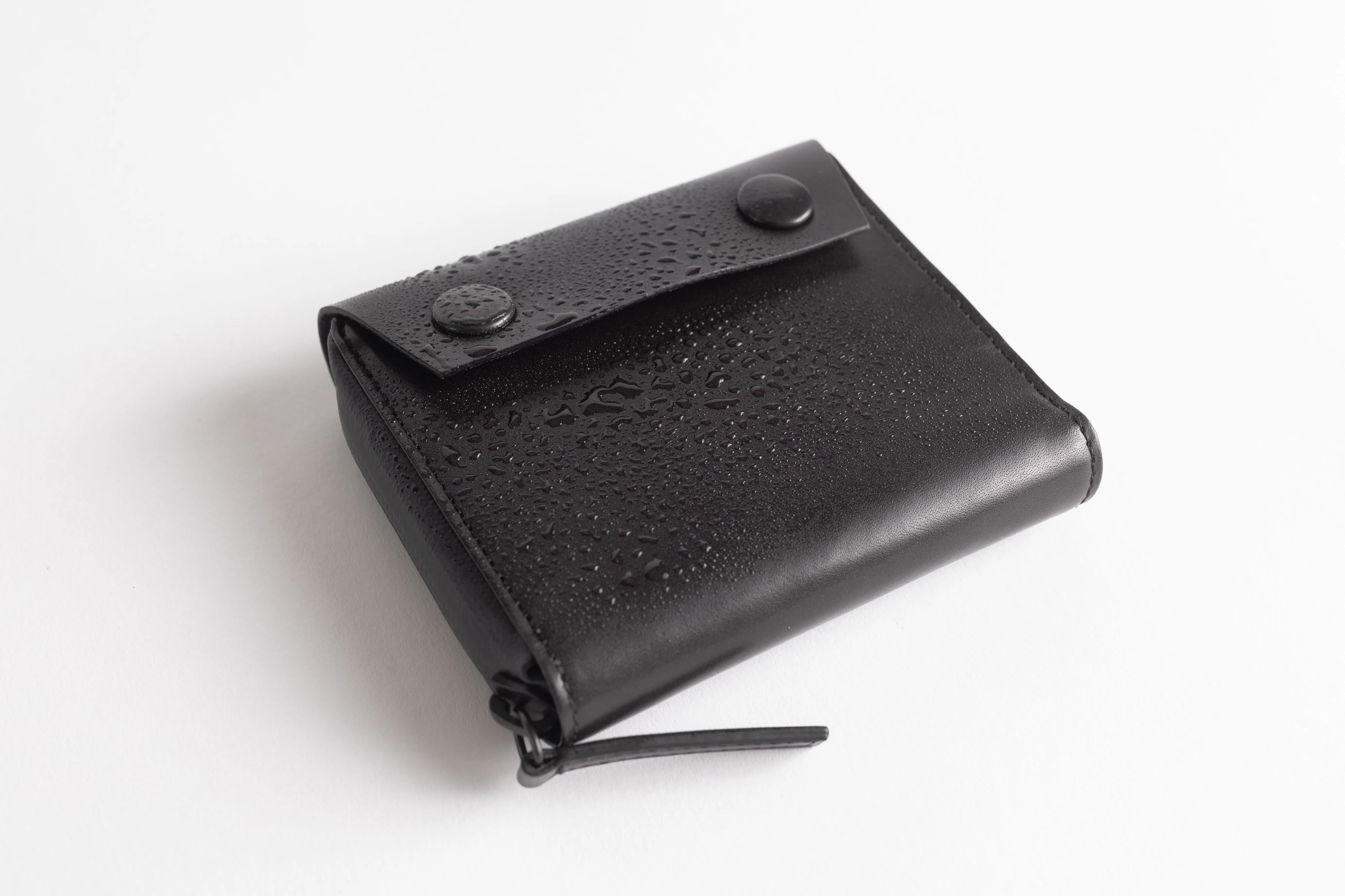 さらに、YKK製の止水ファスナー「AquaGuard®NATULON®」を装備しており、「スコッチガード™」皮革保護剤で加工されたレザーが持つ高い撥水性と相まって、内部の水濡れへの対策は万全です。急な雨から、大切な紙幣や貴重品を守ります。