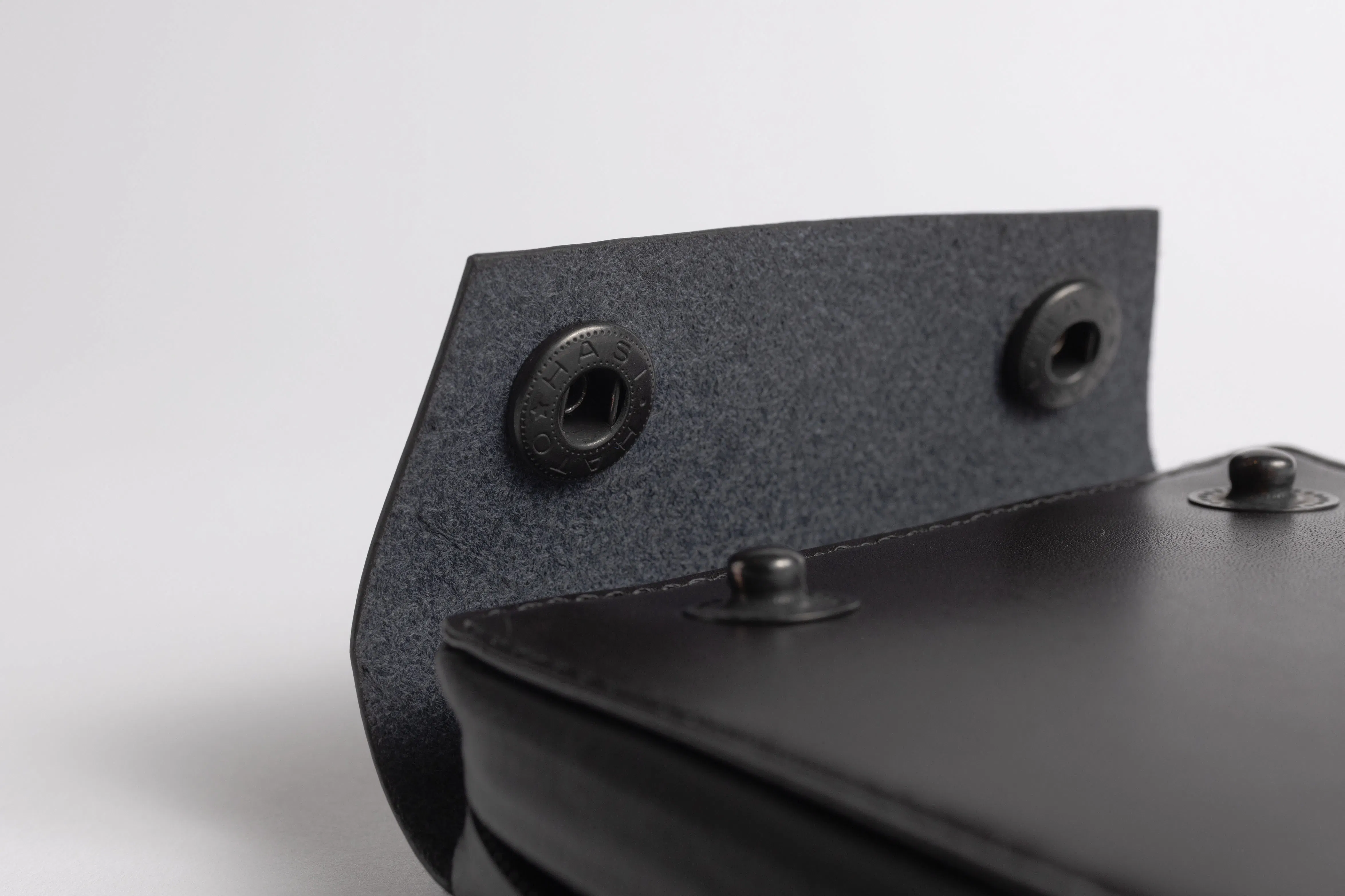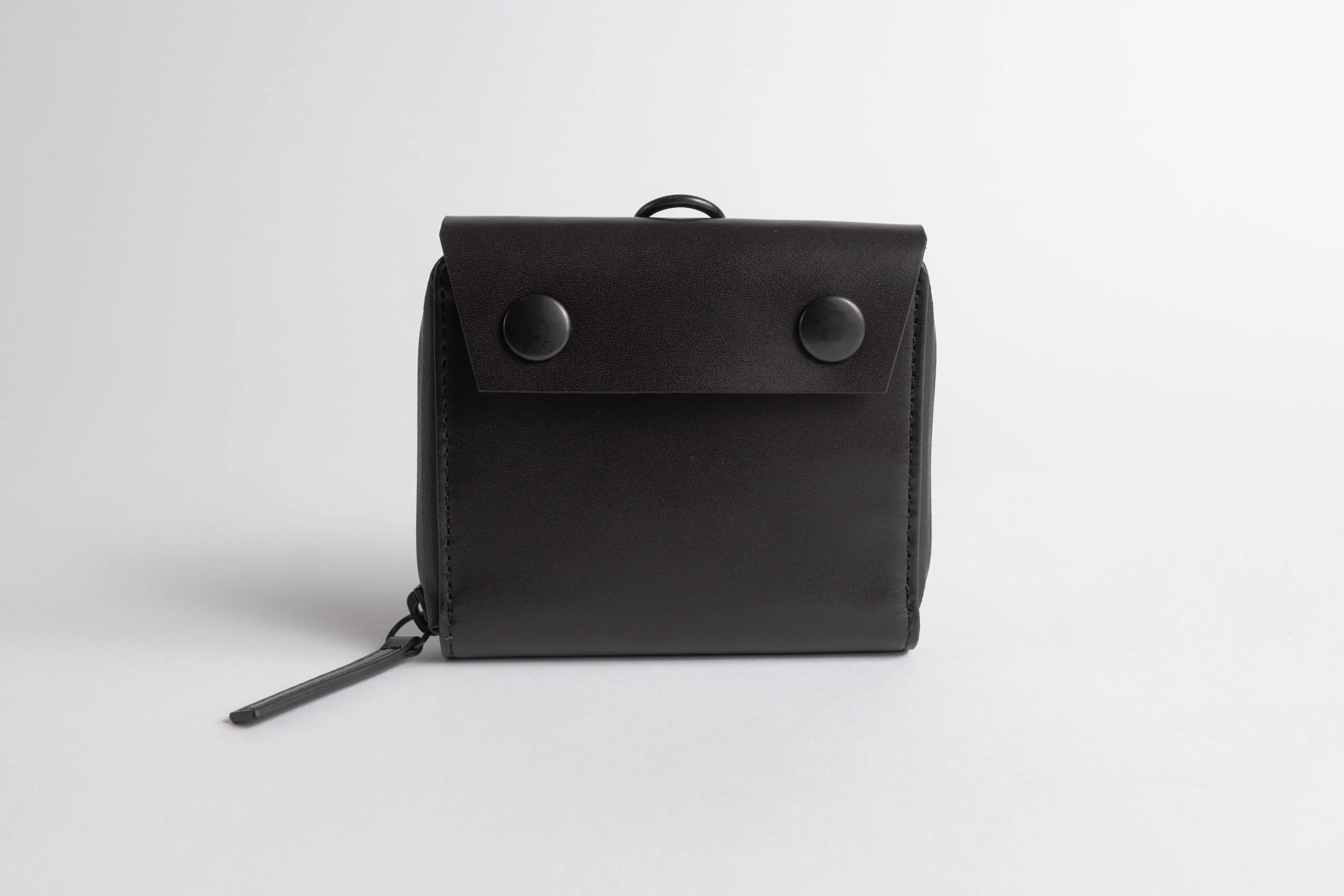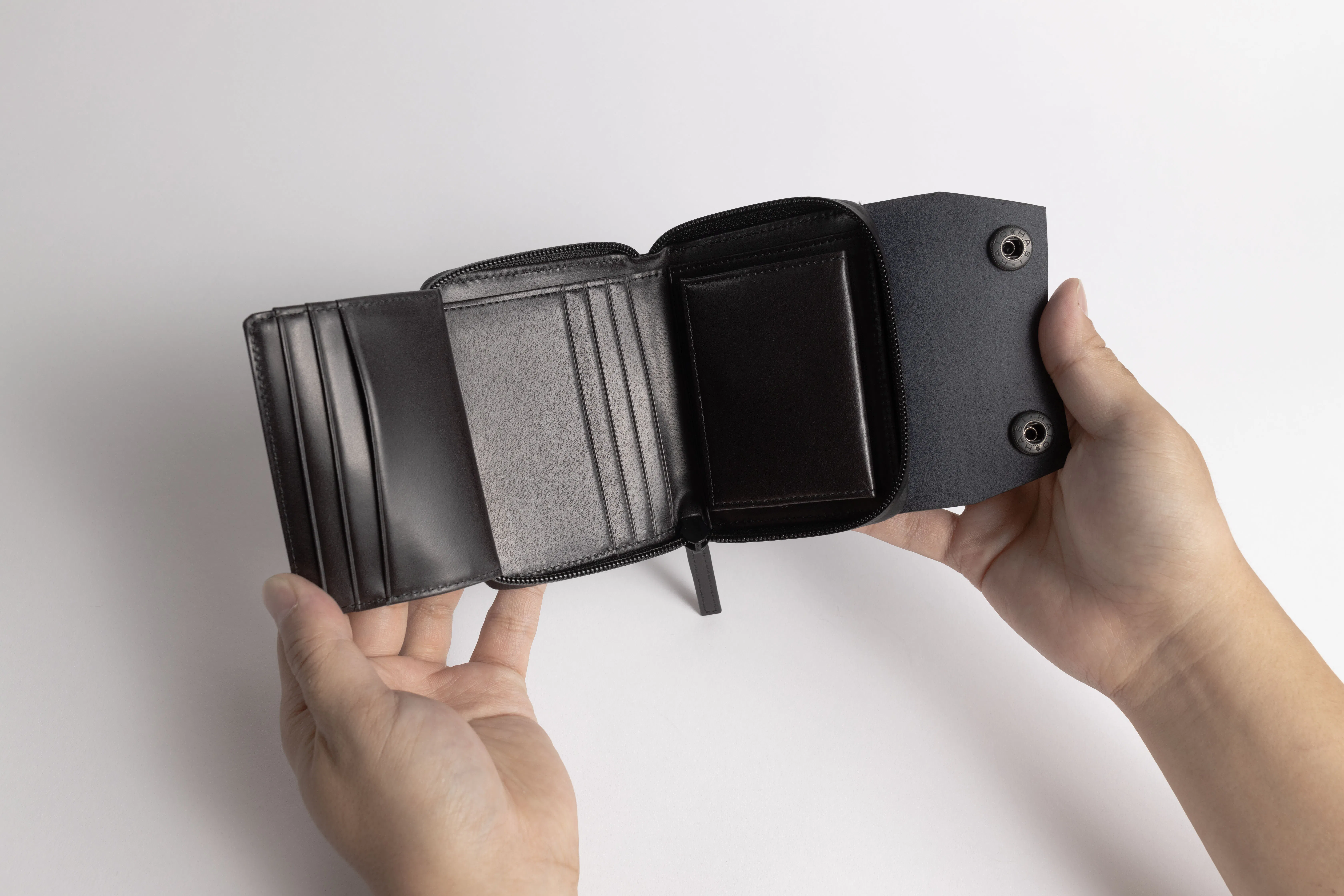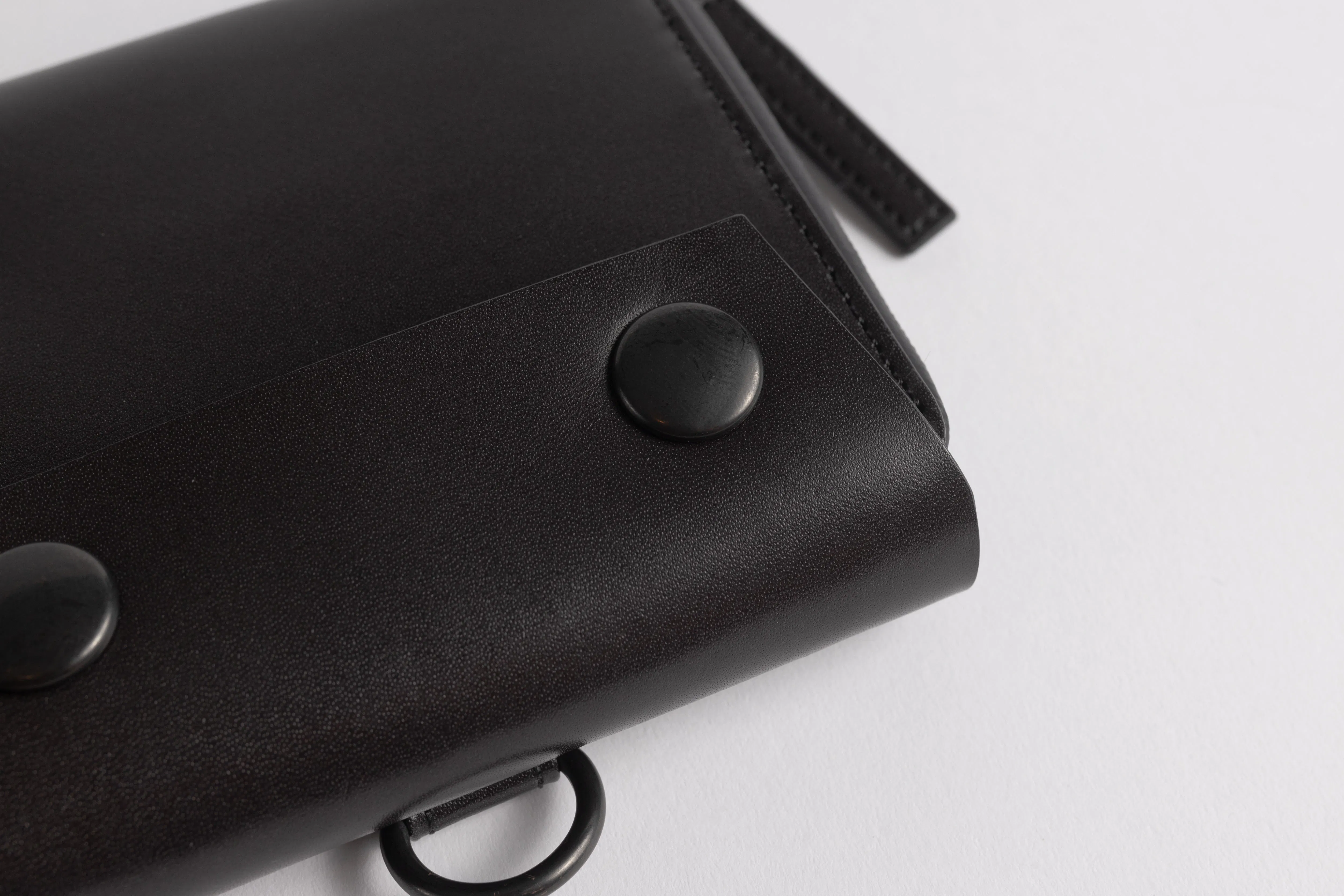 普通の財布とは違って外に見せる使い方ができるので、ファッションとしても楽しんでいただけるようミリタリーテイストを感じさせるスナップボタンとDカンをアクセントになるよう配置、パーツのメッキ加工も統一感を持たせた仕上がりにしています。