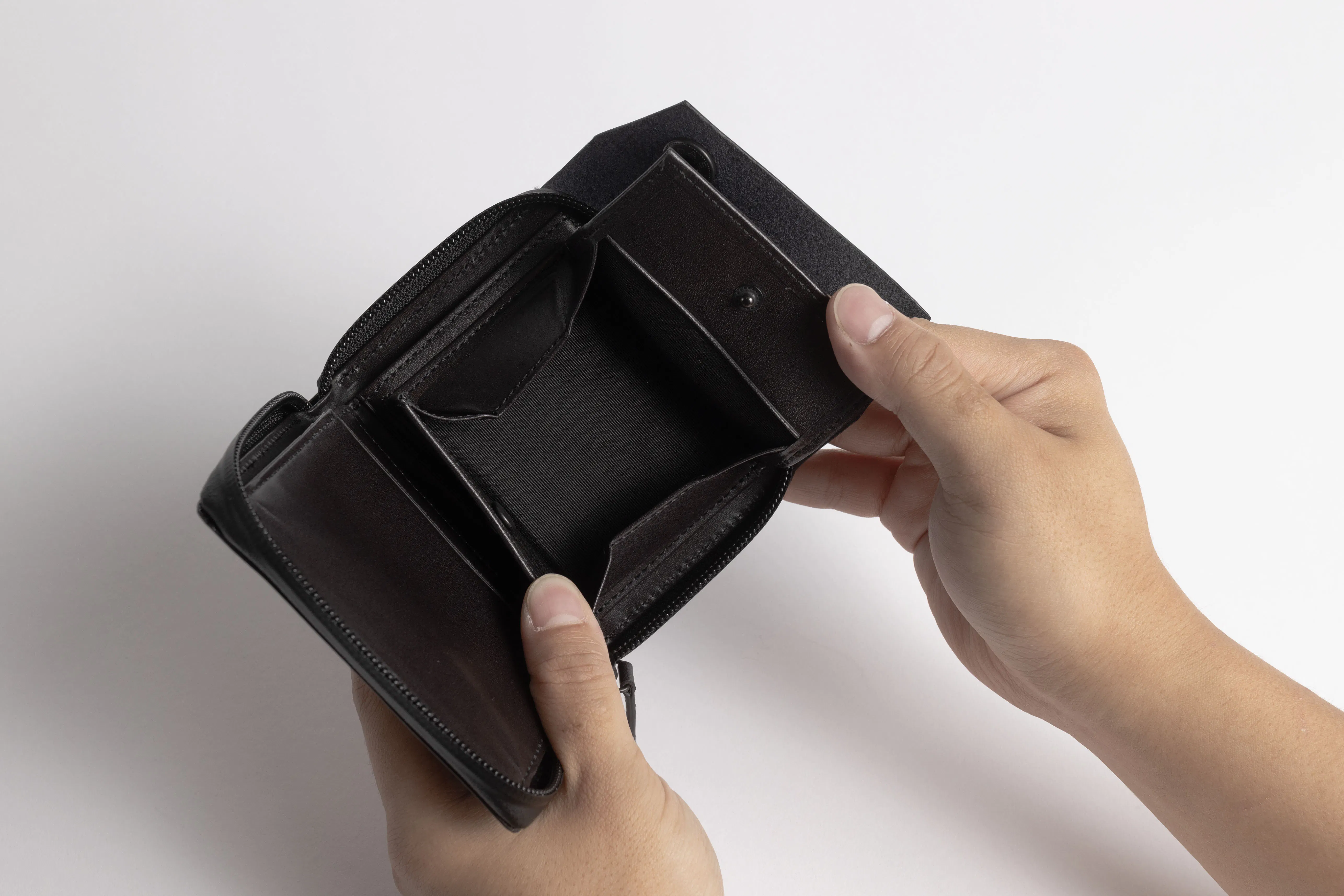 フラップとバネホックで開閉できるコインポケットは、ほどよい深さがあるデザインに。