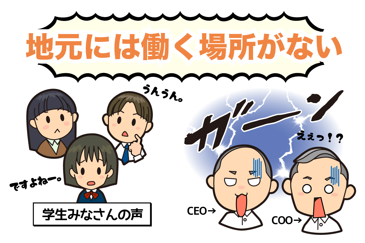 この状況にメスを入れるためには?そこでまず行ったことは学生へのヒアリング調査。地元で働くことに魅力を感じないのはなぜか?と問いかけたところ、「地元には働く場所がない!」という衝撃な一言が・・・、それも一人ではなく何人もの学生の口から・・・