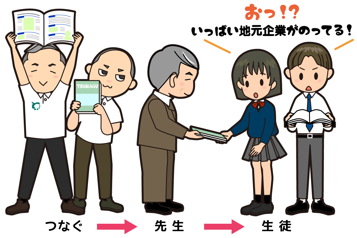具体的には、高校生向けに地元企業で活躍している先輩たちを会社と共に紹介する冊子TSUNAGUを作成し、学校にご協力をいただいて高校生に配布をしています。また、県内3地区で高校生向け企業説明会の開催、地元企業で活躍する先輩たちの働いている様子を紹介する会社見学動画の製作・配信などを行っています。これらを通して、地元にも元気な企業はたくさんあることを知ってもらい、地元就職、Uターン就職により育った地域で頑張りたい!につながって欲しいと取り組んでいます。