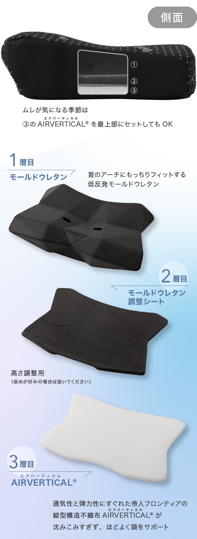 ●その他:お届け時は [上層] モールドウレタン [中層] モールドウレタン調整シート [下層] 縦型構造不織布 AIRVERTICAL® のようにセットされています。もっちりソフトな寝心地でありながら、しっかりサポートしてくれます。/お好みの寝姿勢でご使用ください。(仰向け、横向き、うつぶせ)/高い面と低い面があります。お好みの高さの面をご使用ください。/さらに低くしたい場合は、中層のウレタン(調整シート)を1枚抜いて調整してください。/縦型構造不織布 AIRVERTICAL® 層を、上段に入れ替えて使うことも可能です。
