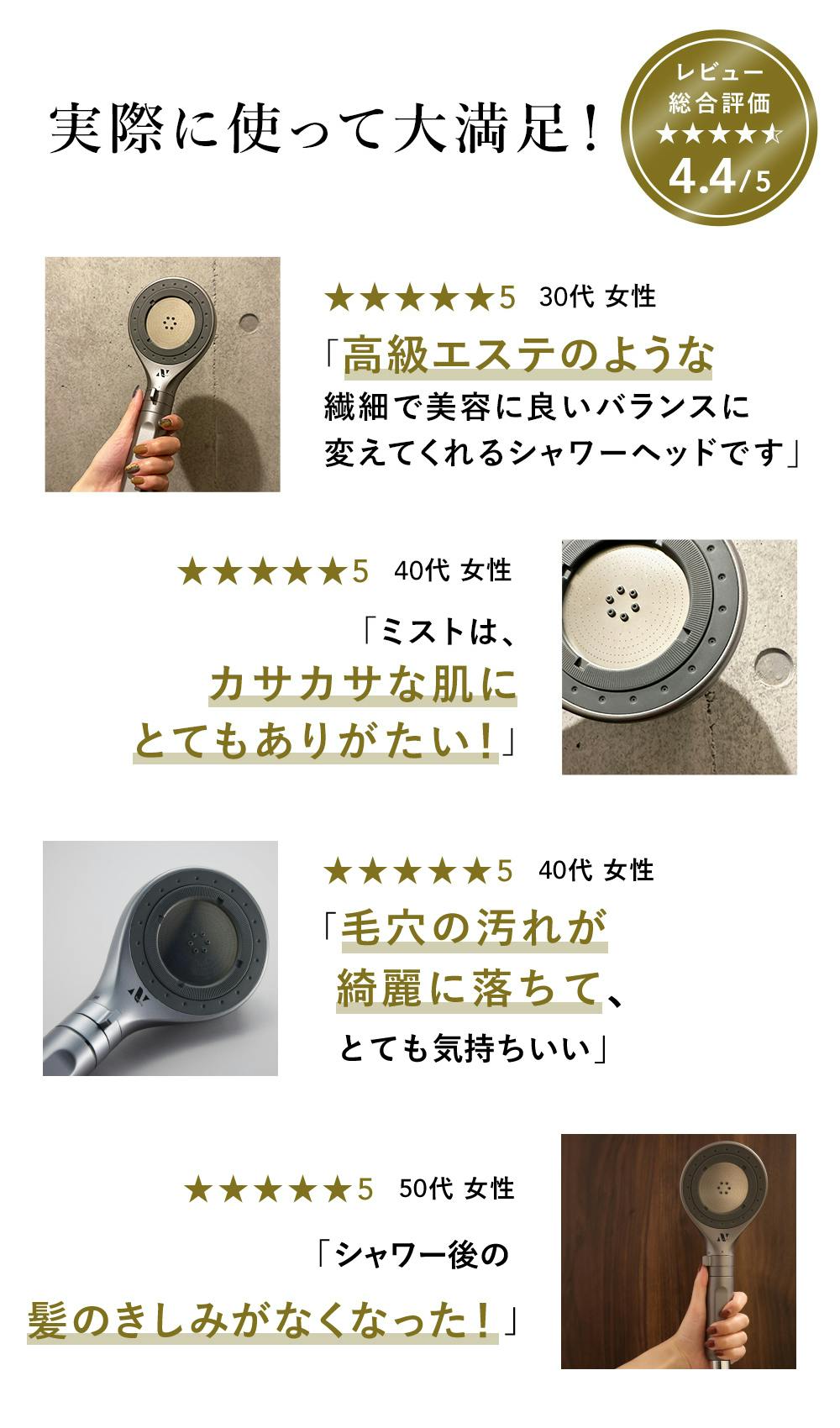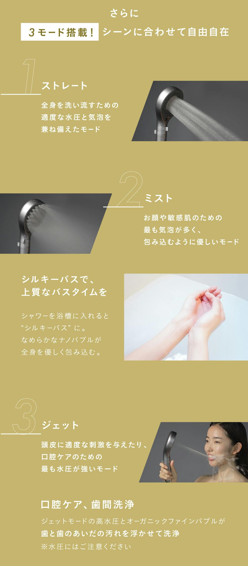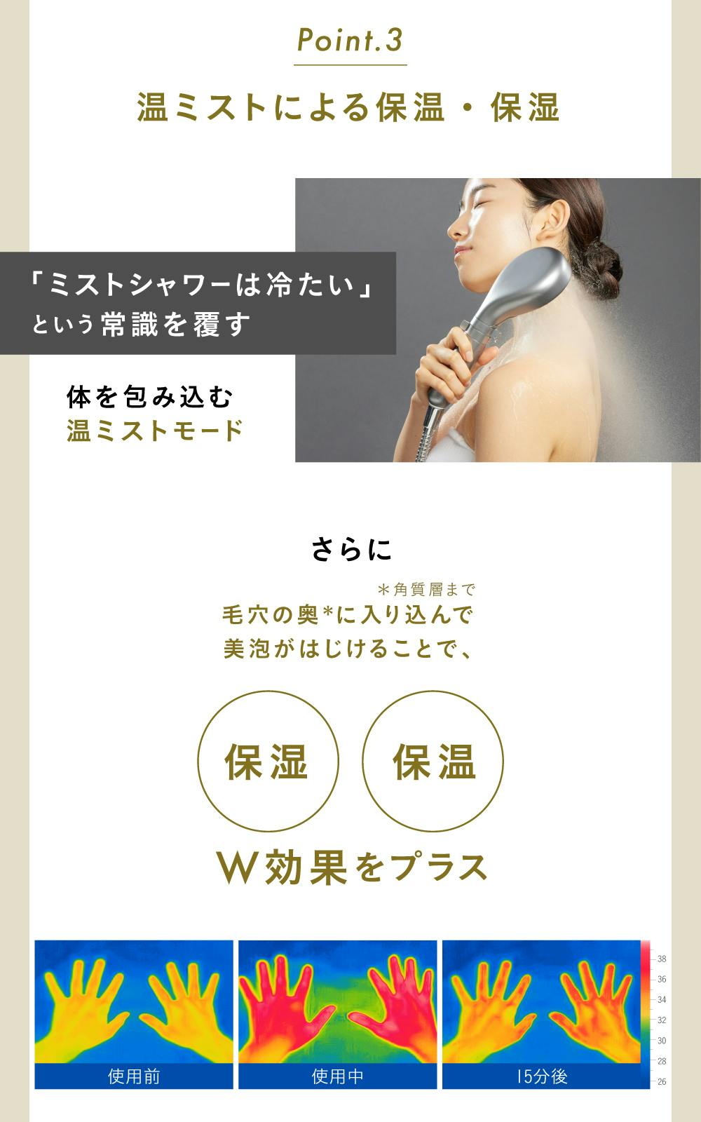 なお「ミストモード」は霧状のため、その他のシャワーモードと比較して体感温度が低下して感じることがありますが異常ではございません。お肌の仕上げなどにお使いください。
