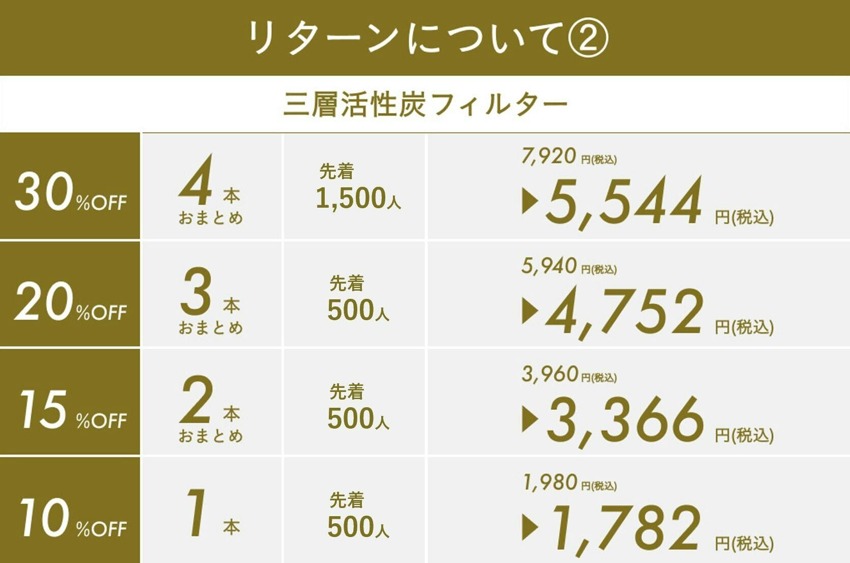 A:シャワーヘッド本体に塩素除去などの浄水機能はありません。三層構造活性炭フィルターを取り付けることで塩素除去されます。
