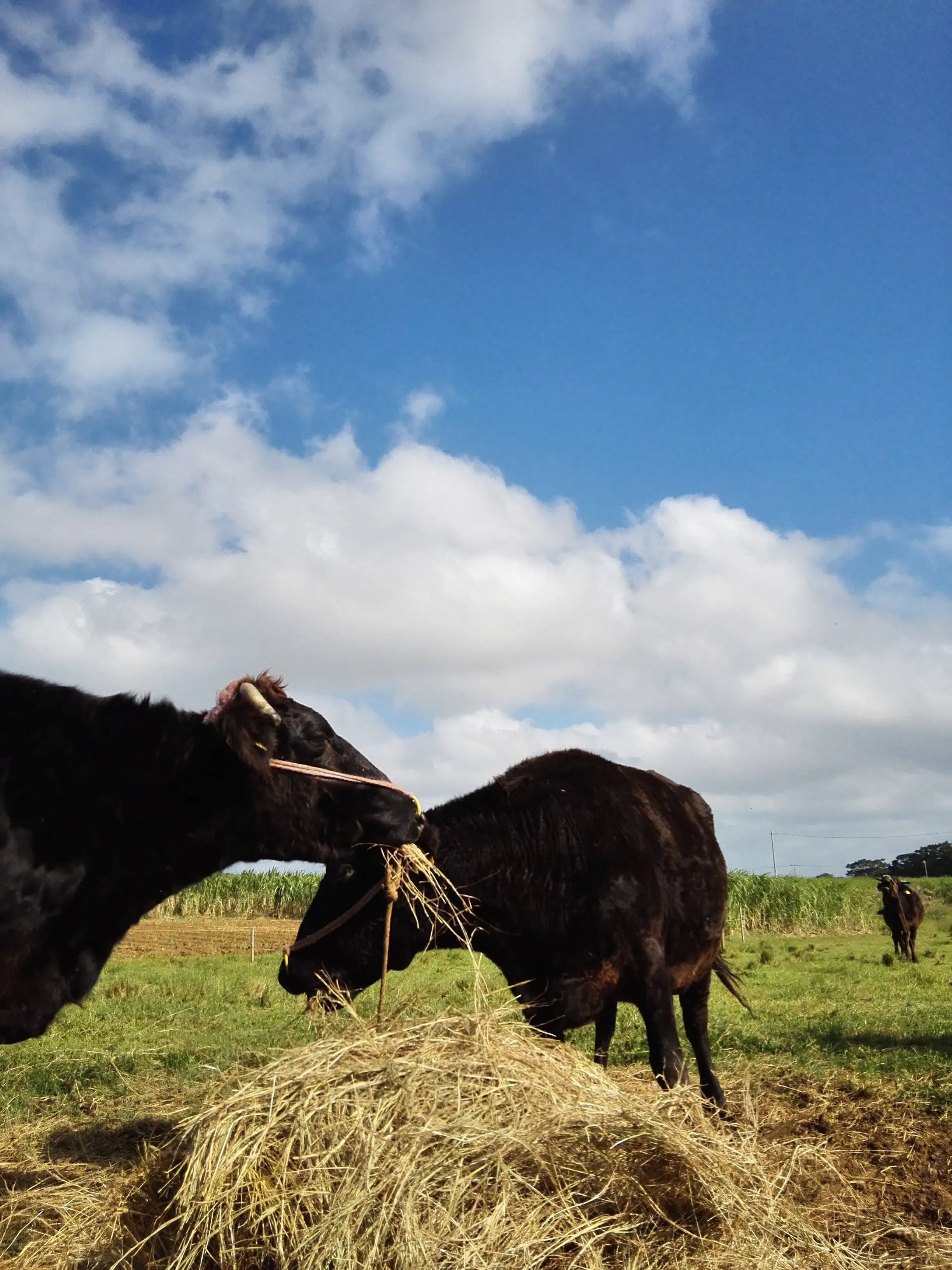 一方、我が家の和牛肉の『美味しい』は、従来の和牛肉とかなり違う方向性です。私のところでは長年繁殖用に供してきた『成牛』を肥育しています。放牧地に放ち、のびのびと過ごさせながら、1年以上かけて肥育して行きます。久米島は国内でも類を見ないほどの粗飼料自給率が高い島で、我が家の牛には100%久米島産の牧草を食べさせています。