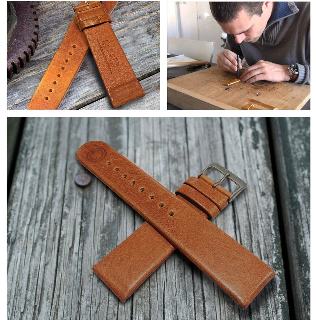 ストラップに使われているのは、イタリア製の天然皮革です。美しいシボ感に、メーカーであるOUDの刻印が押されています。