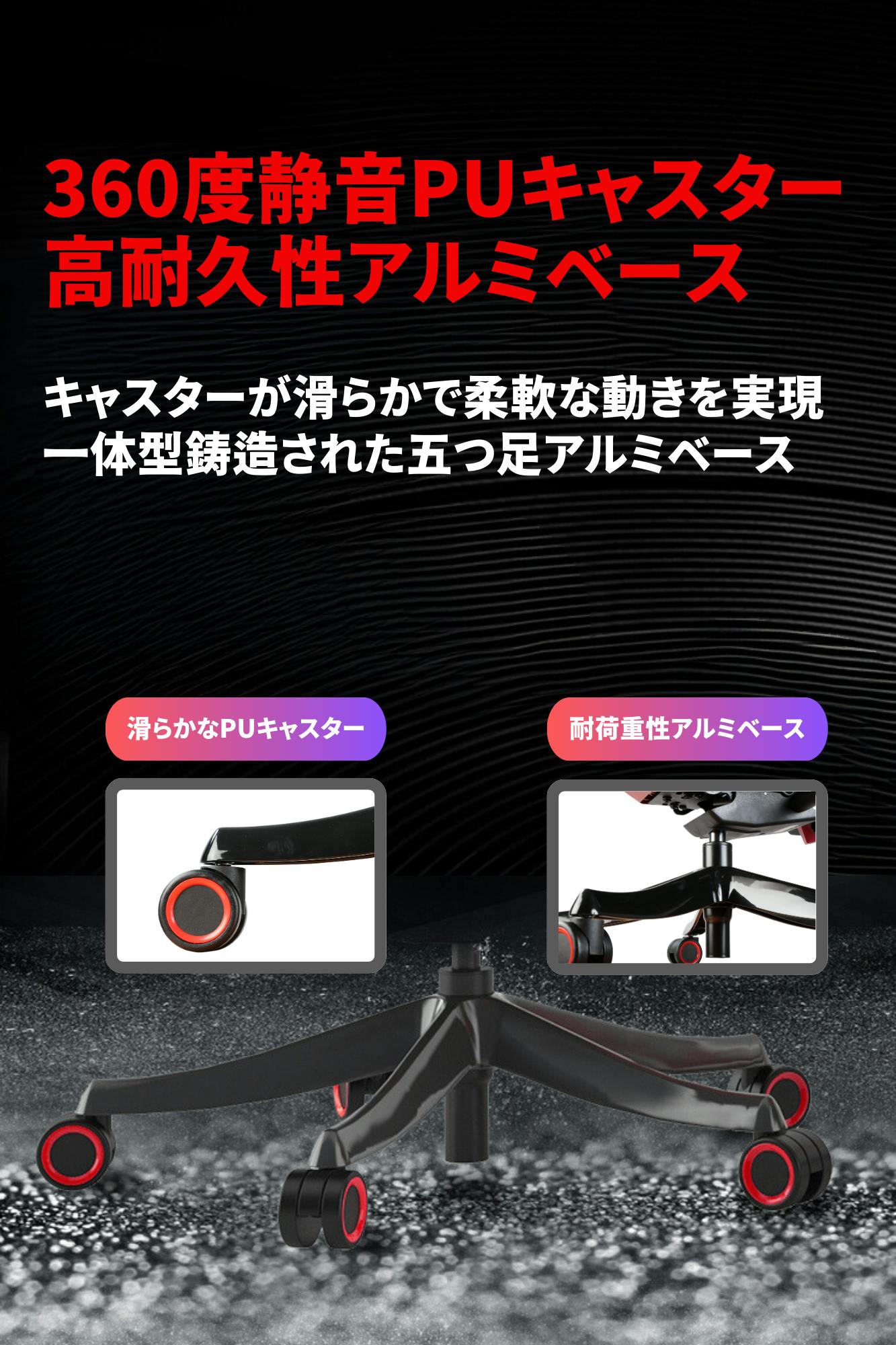 ・アルミニウム製ベースは、一体型鋳造成形により製造され、五つ足が強力な支持力を提供し、耐摩耗性と耐傷性に優れています。高い耐荷重性を実現しながらも、変形することなく、長期間にわたりその形状と機能を維持します。