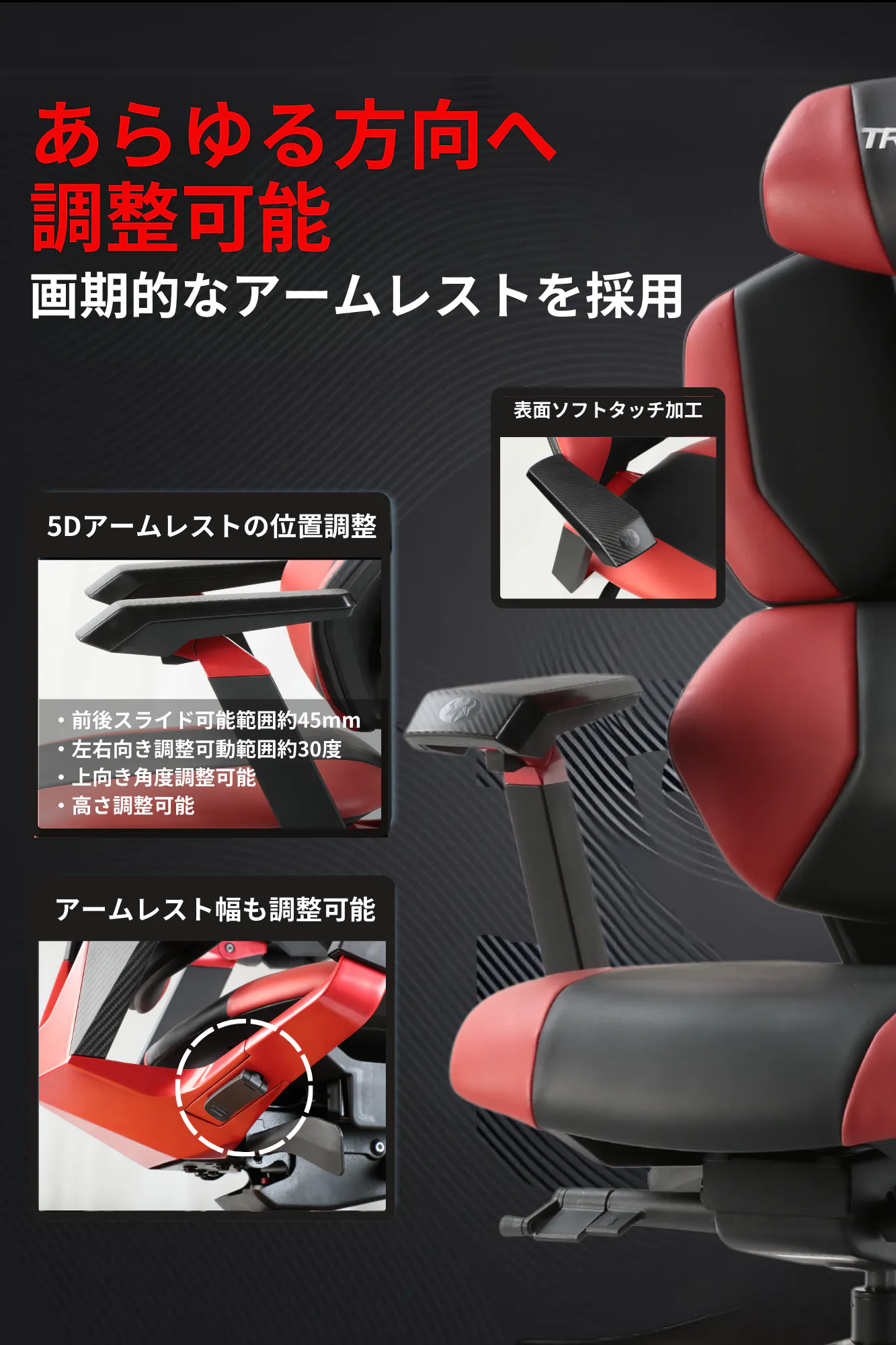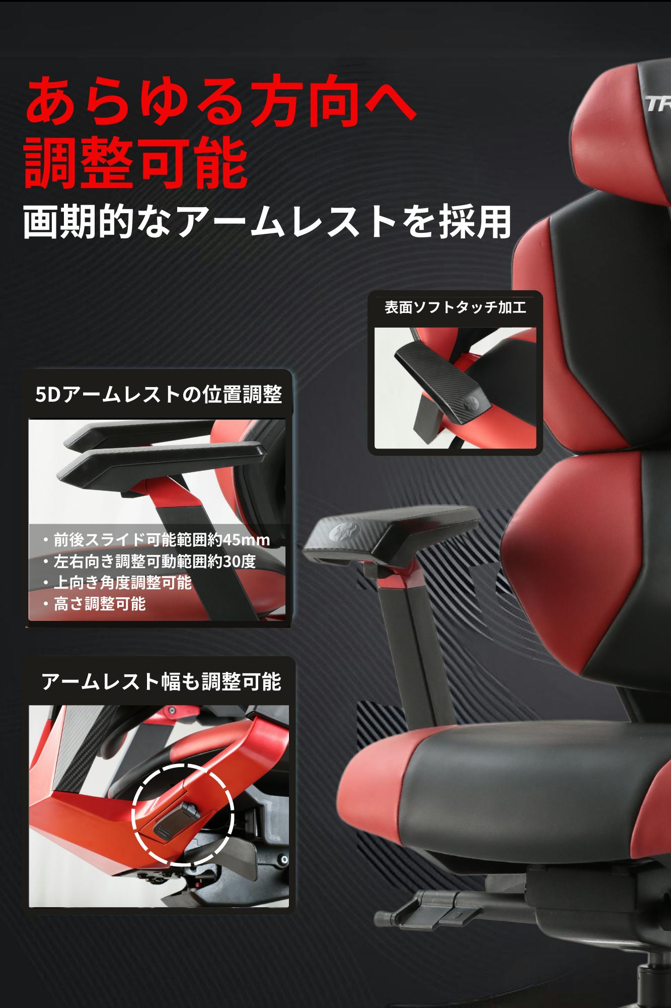TG-01ゲーミングチェアはあらゆる方向へ調整可能な革新的なアームレストを採用しています。