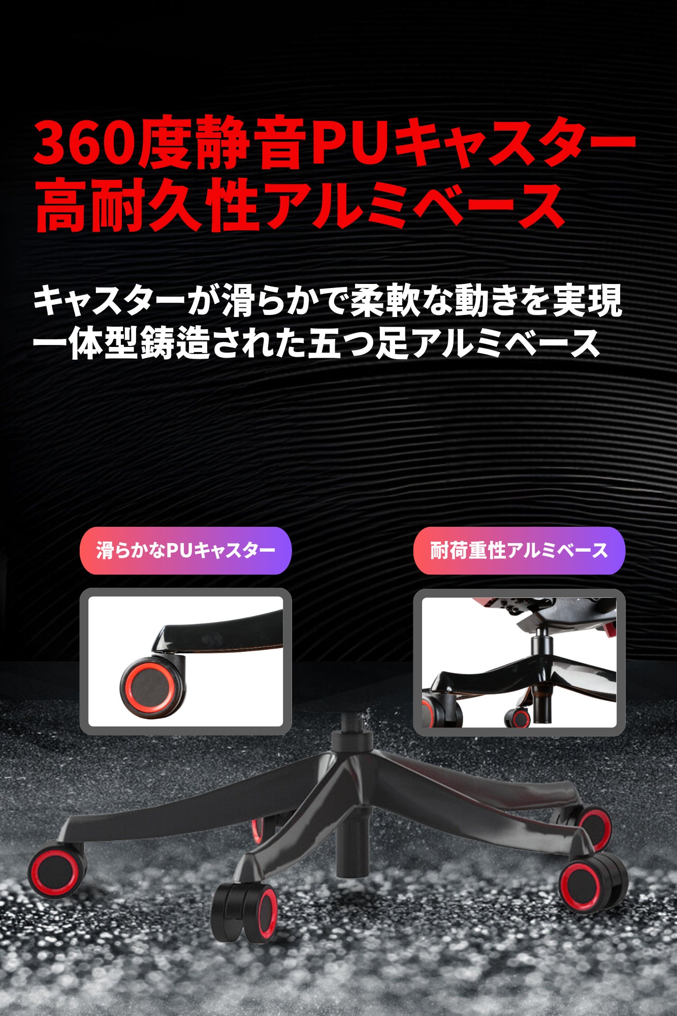 アルミニウム製ベースは、一体型鋳造成形により製造され、五つ足が強力な支持力を提供し、耐摩耗性と耐傷性に優れています高い耐荷重性を実現しながらも、変形することなく、長期間にわたりその形状と機能を維持します。