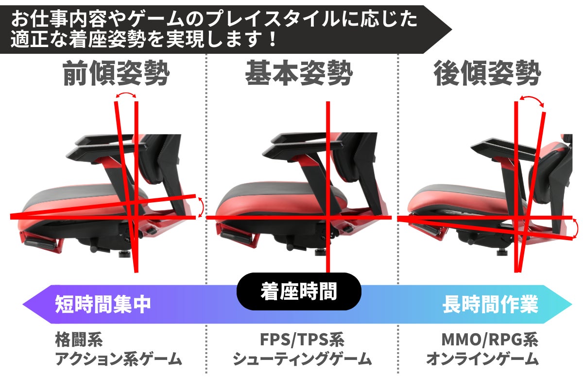 TG-01ゲーミングチェアは、座面の前傾後傾角度を調整することで、仕事やゲームプレイに最適な姿勢をサポートします。