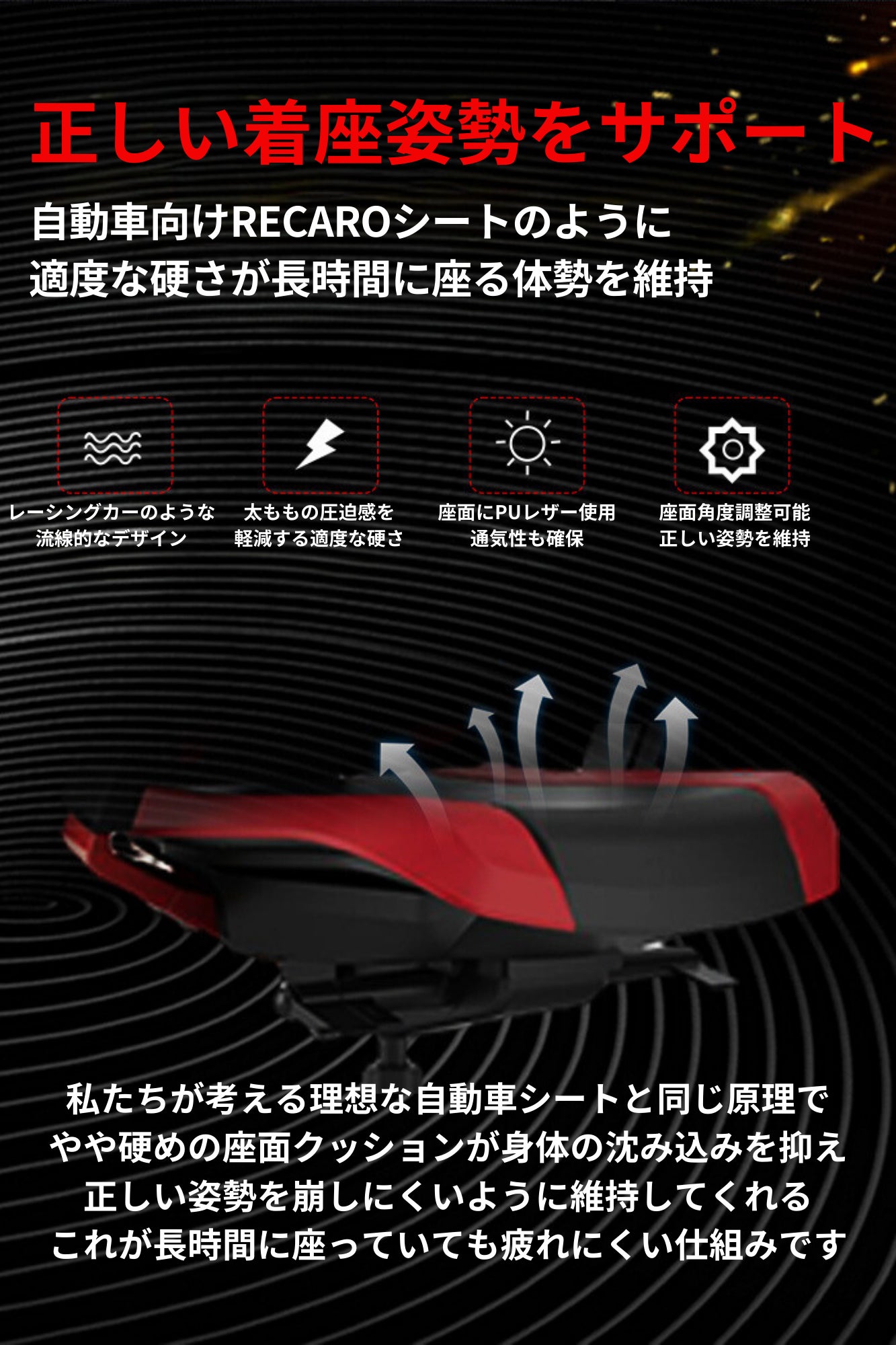 自動車用RECAROシートの設計理念を取り入れ、適度な硬さの座面クッションが、体勢の安定を保ち、レーシングカーを彷彿とさせる流線的なデザインが、太ももの圧迫感を軽減します。座面角度の調整機能により、長時間座っても正しい姿勢を維持できます。