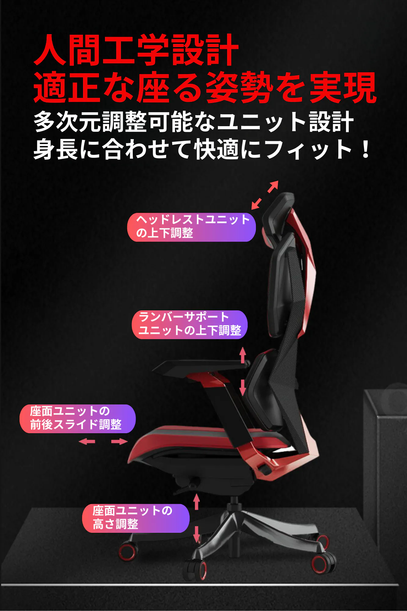 ヘッドレストの上下調整、ランバーサポートの上下調整、さらには座面ユニットの前後スライド調整と高さ調整が可能な多次元調整機能を備え、あらゆる身長のユーザーに快適なフィット感を提供します。一度あなたに最適なポジションに設定すれば、毎回同じ快適なシッティングポジションでチェアに座ることができ、長時間の作業でも疲れにくい快適な座り心地を実現します。