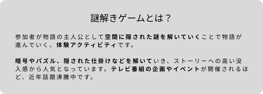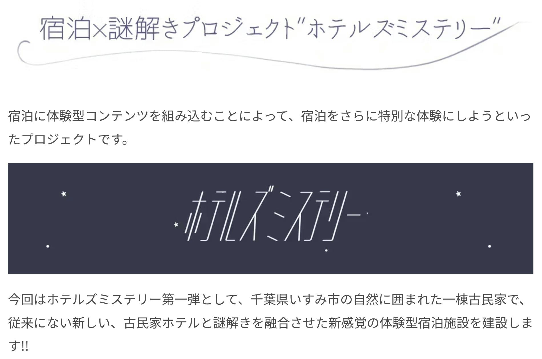 宿泊を伴う体験を制作する、ホテルズミステリー様とコラボレーションをして通常の宿泊プランの他に謎解き体験付きプランをご用意します。