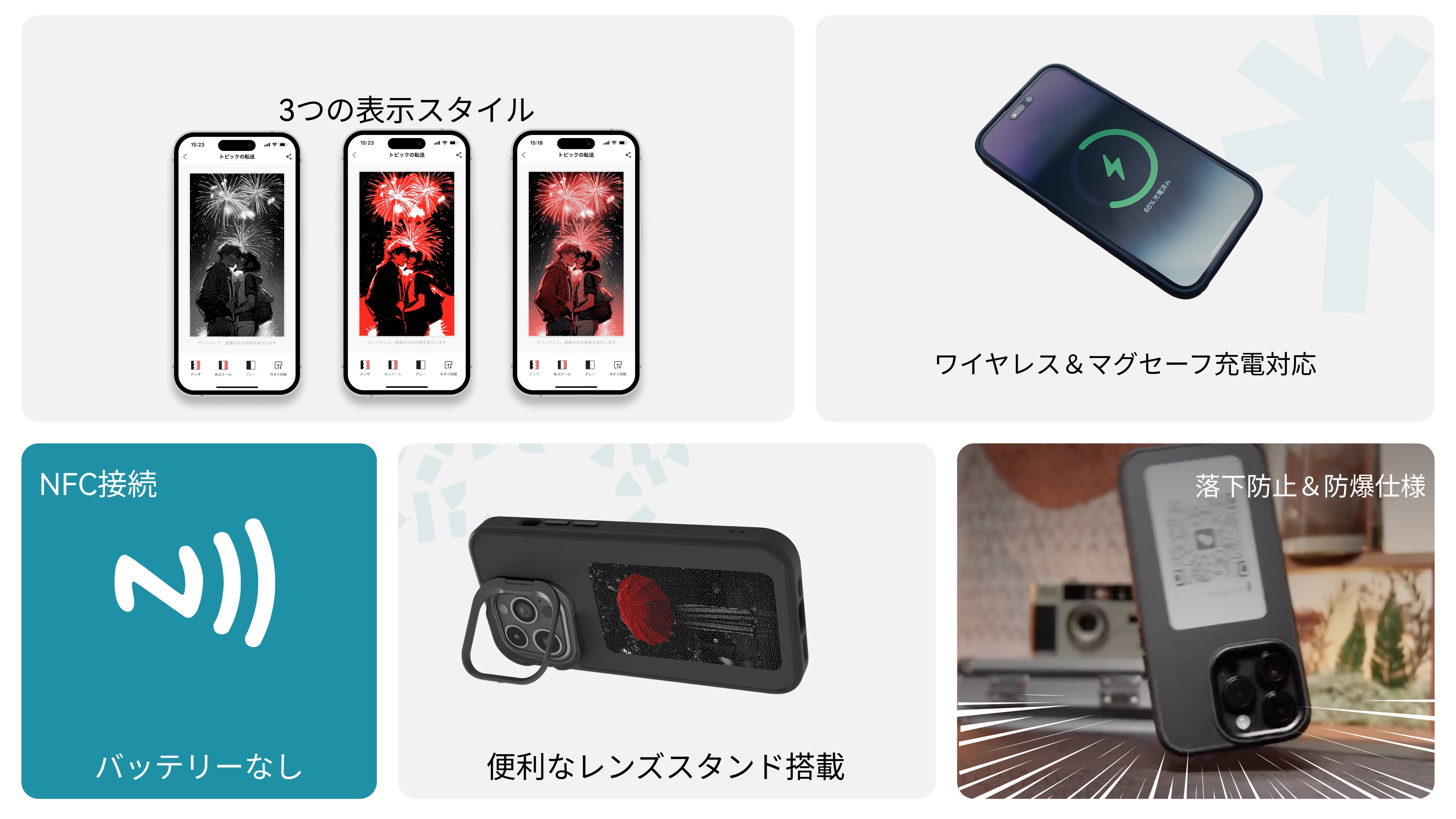 さらに、私たちはそれだけにとどまりません。革新的なE-Inkスクリーンが用いられた「Reink Case」も発表した。E-Inkスクリーンと言えば、電子書籍リーダーを連想する方が多いでしょう。しかし、私たちはE-Inkスクリーンの応用はそれだけにとどまらないと考えています。"E-Inkスクリーンとスマホケースを組み合わせるのはどうだろう?" - この問いから「Reink Case」が誕生しました。E-Inkスクリーン技術をスマホケースに統合することで、私たちは新しいユーザー体験をもたらすユニークな製品を生み出しました。