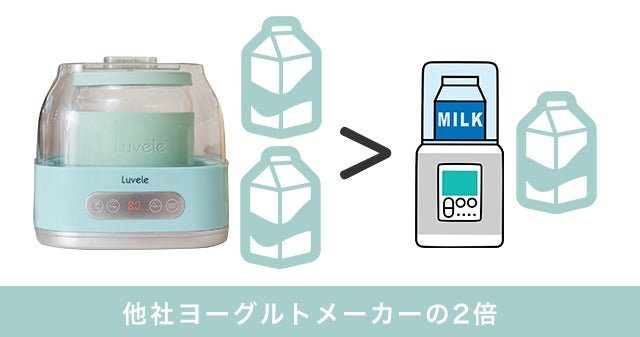 一般的なヨーグルトメーカーが作れる量は、牛乳パック1本分(約1L)程ですが、Luveleは約2倍の量(約2L)を1度に作ることができます。