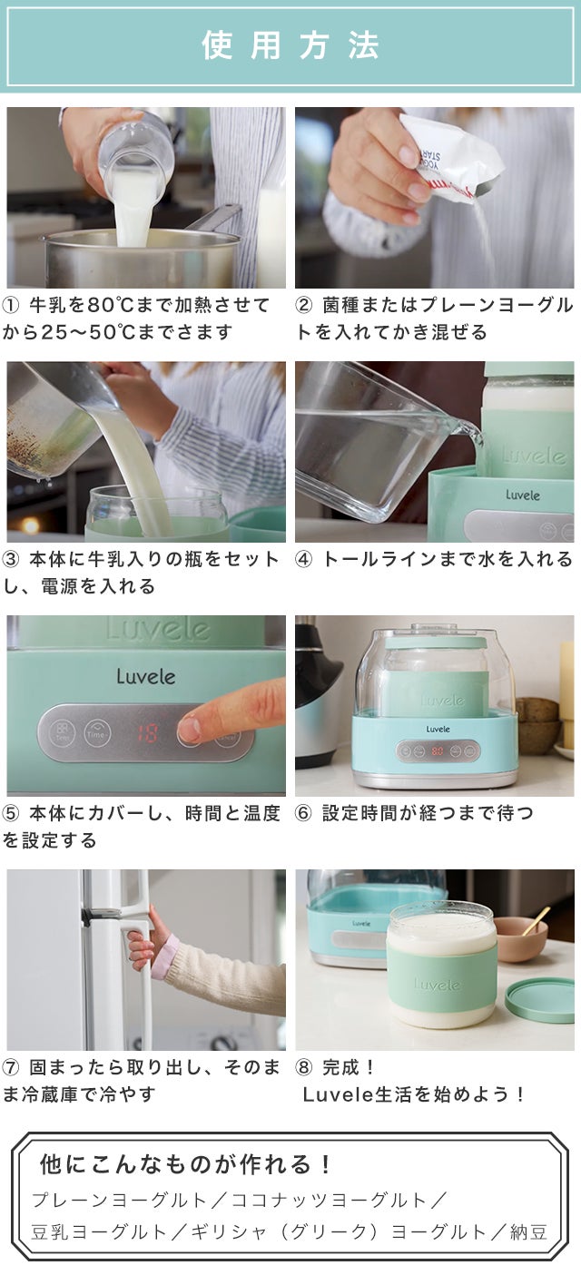 Luveleヨーグルトメーカーを使えば、牛乳とお好きなプレーンヨーグルトまたは種菌のみで簡単にヨーグルトが作れます。
