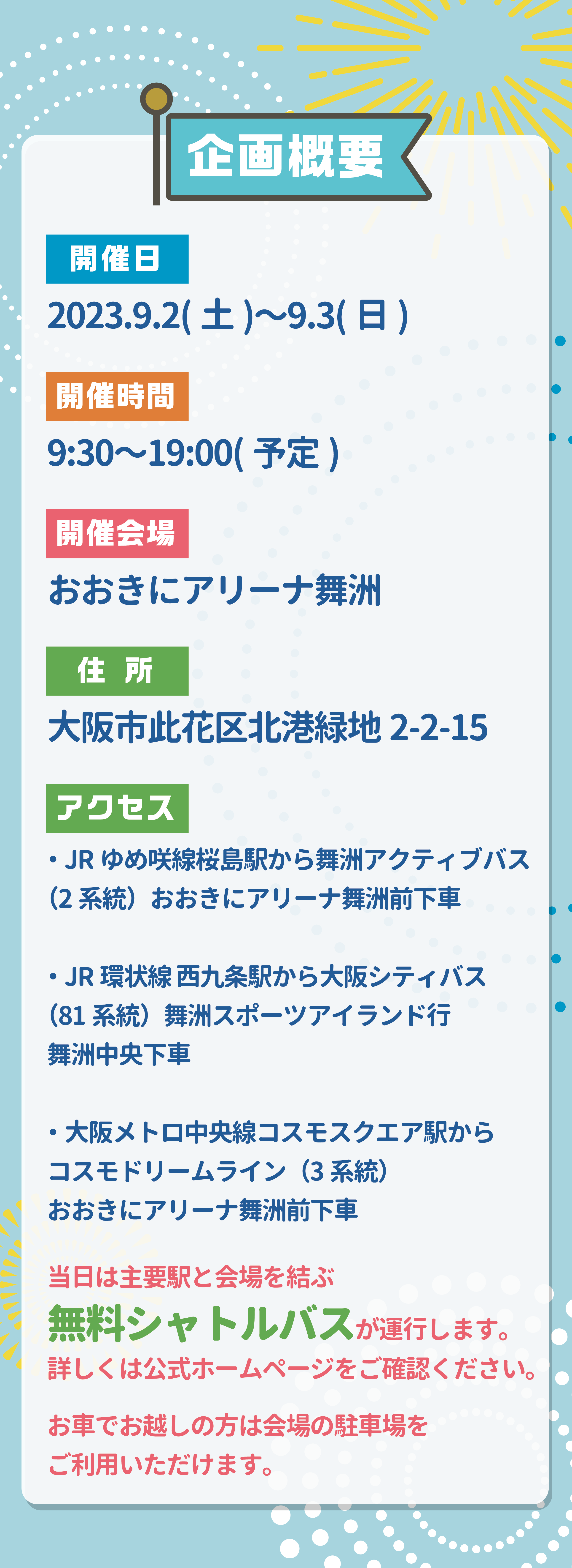 ※当日の開催イベント・タイムスケジュールは、やむを得ない事情により変更となる場合もございます。ご来場の際にはホームページにてご確認ください。