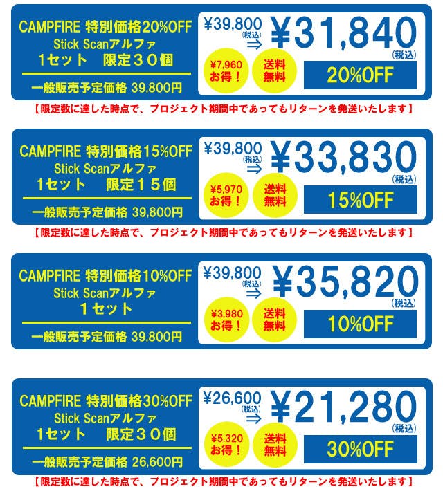 2023/10/21 09:55サポーターの皆様このたびはご支援とたくさんのお気に入りをありがとうございます。プロジェクト期間が残り1日を切りました。お気に入りをしていただいてStickScanにご関心をお持ちの方は、プロジェクトが過ぎてしまうとこのご支援額でご支援いただけなくなりますので、この機会をお見逃しなくこのプロジェクトが終了する前にご支援を賜りましたら幸いです。引き続きStickScanをよろしくお願い申し上げます。 株式会社フェリクス もっと見るプロジェクト期間が残り5日を切りました