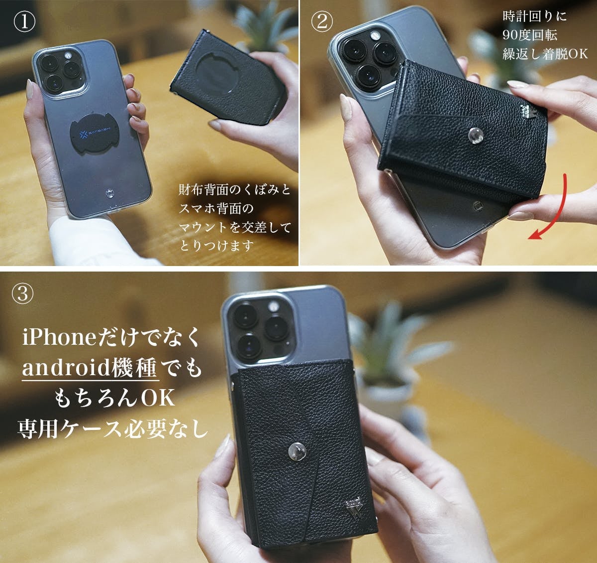 ※マウントを用いて財布とスマホをドッキングする仕組みのため、スマートフォンの機種や専用のケース等の縛りがなく、お使いのスマホへすぐに装着が可能です。(ただしケース素材と取付用マウントの貼付け相性があるため、スマホケースの種類によっては財布とスマホを取り付けれない場合があります。詳細はページ下部のご使用上の注意事項をご参照ください)