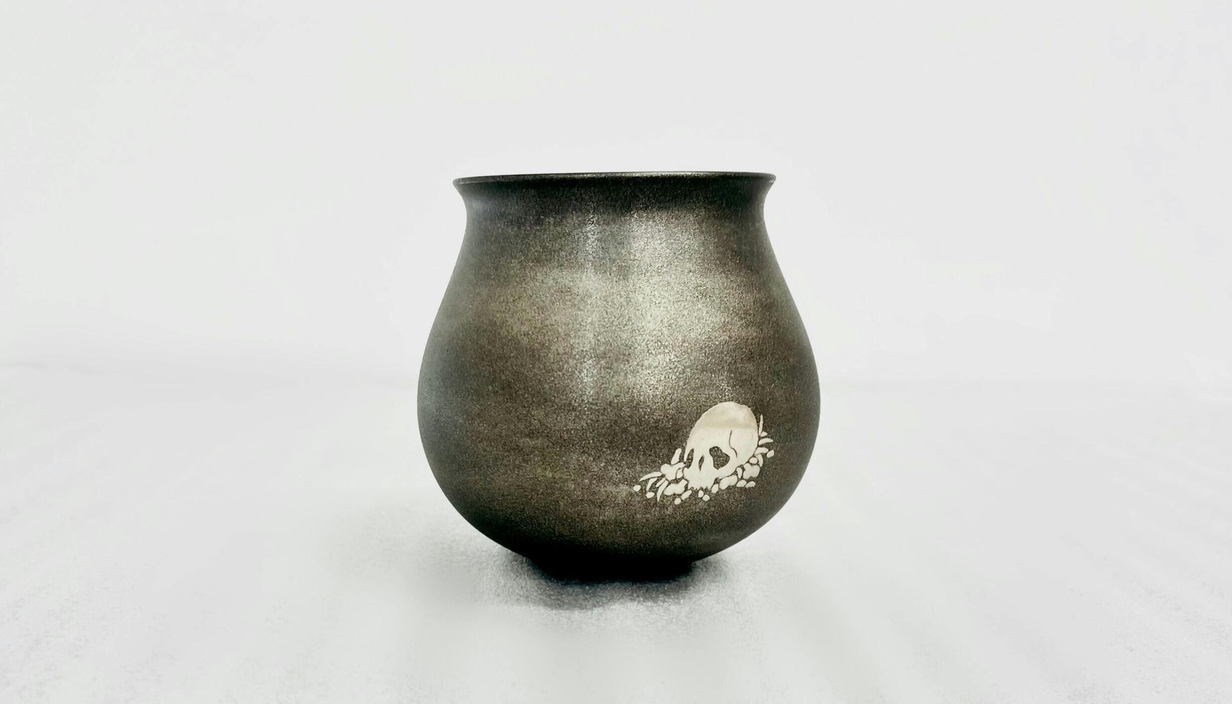 繊細な蒔絵で描かれているのは、崩れ落ちそうな骸骨(スカル)と、それに呼応するブドウの芽吹きのシーンです。
