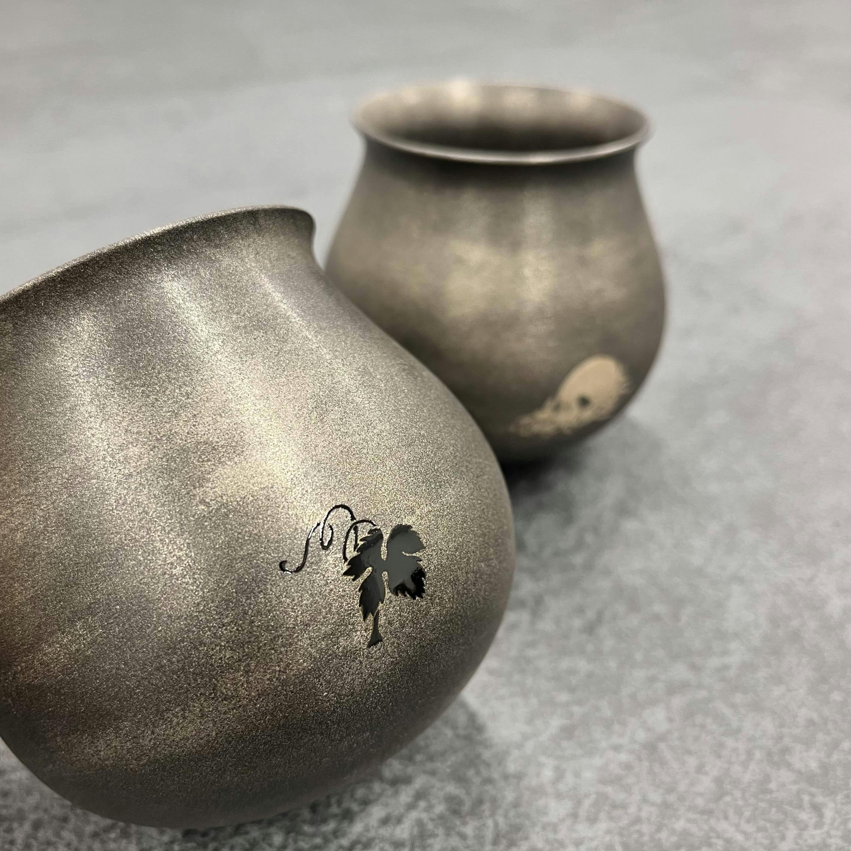 独特なメタリックな風合いは、まるで金属や石器のように見えるのに、持つと軽くて優しい手触りに驚きます。
