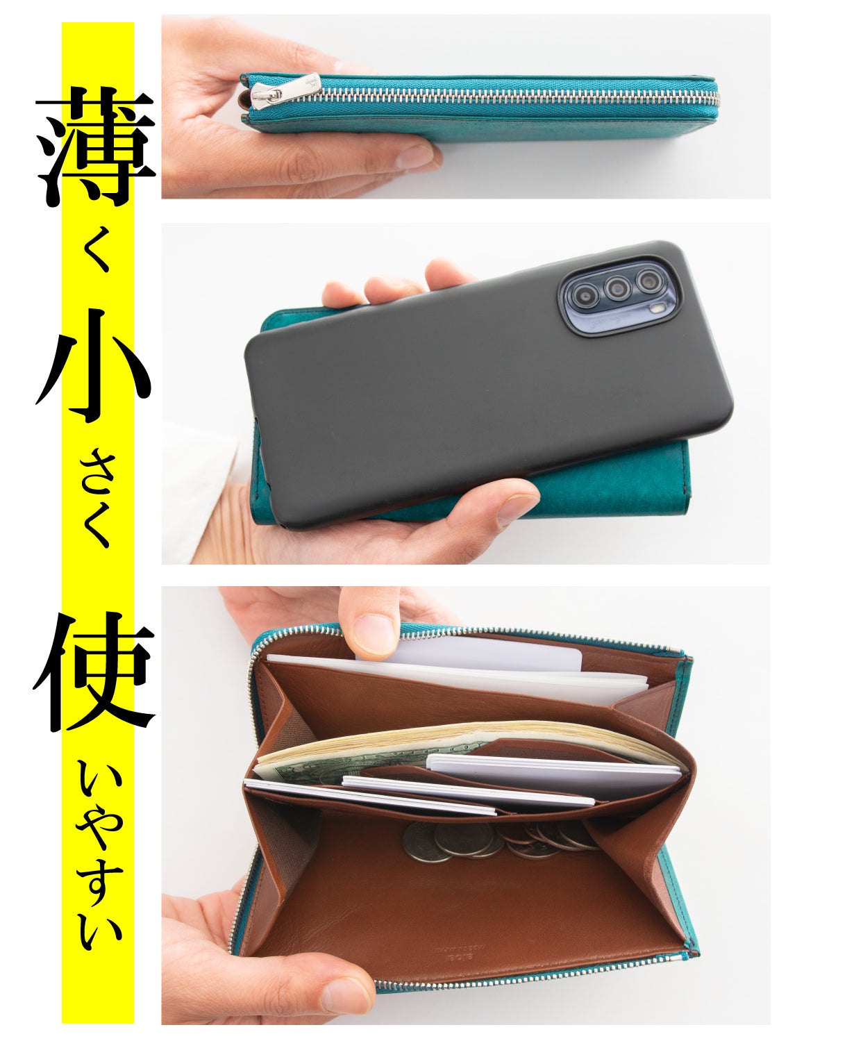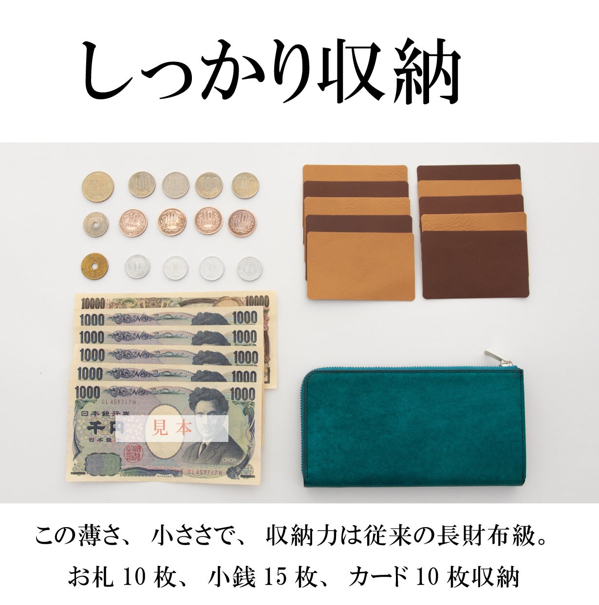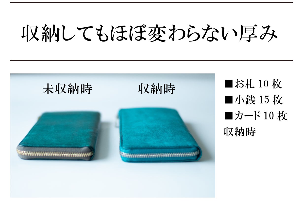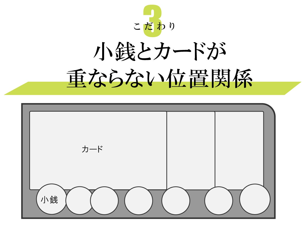 カードと小銭の重なりを最小限に抑えた構造になっているため、たくさん入れても嵩張りにくくなっています。