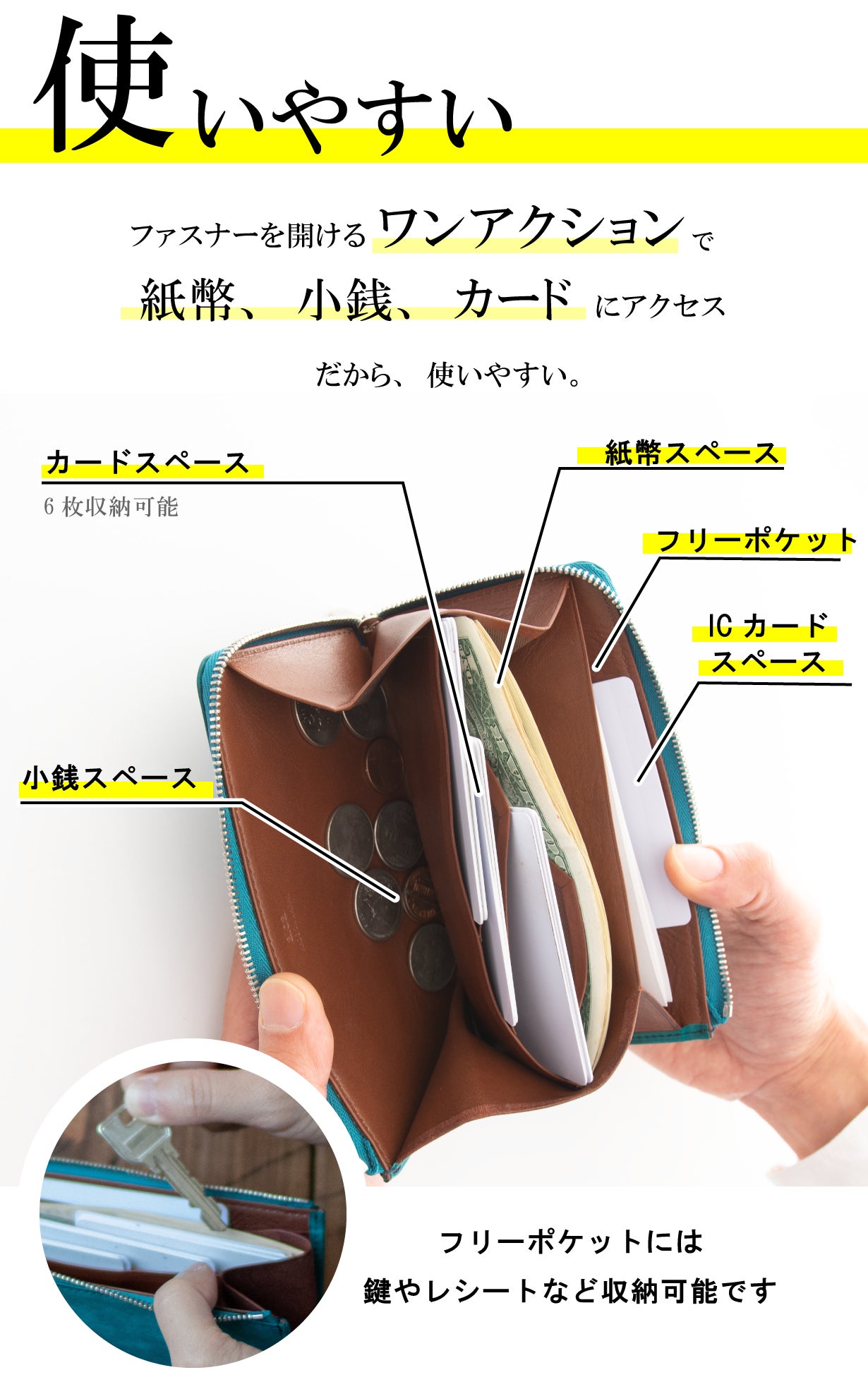 小銭入れスペースは大きく開くので取り出しやすく、収納も超簡単に。