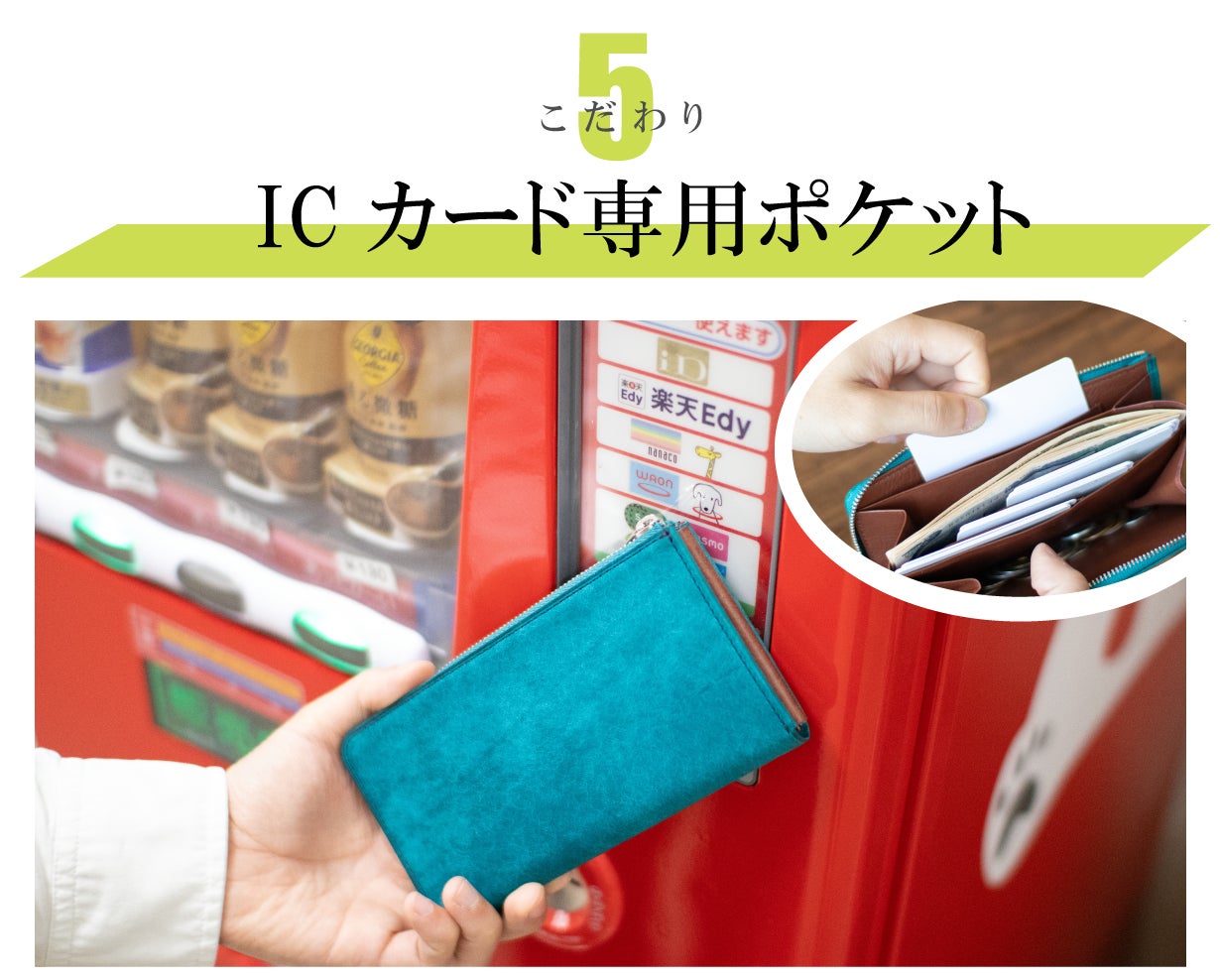 ICカード専用ポケットにICカードを入れておけばファスナーを開かずにタッチ決済が可能に。