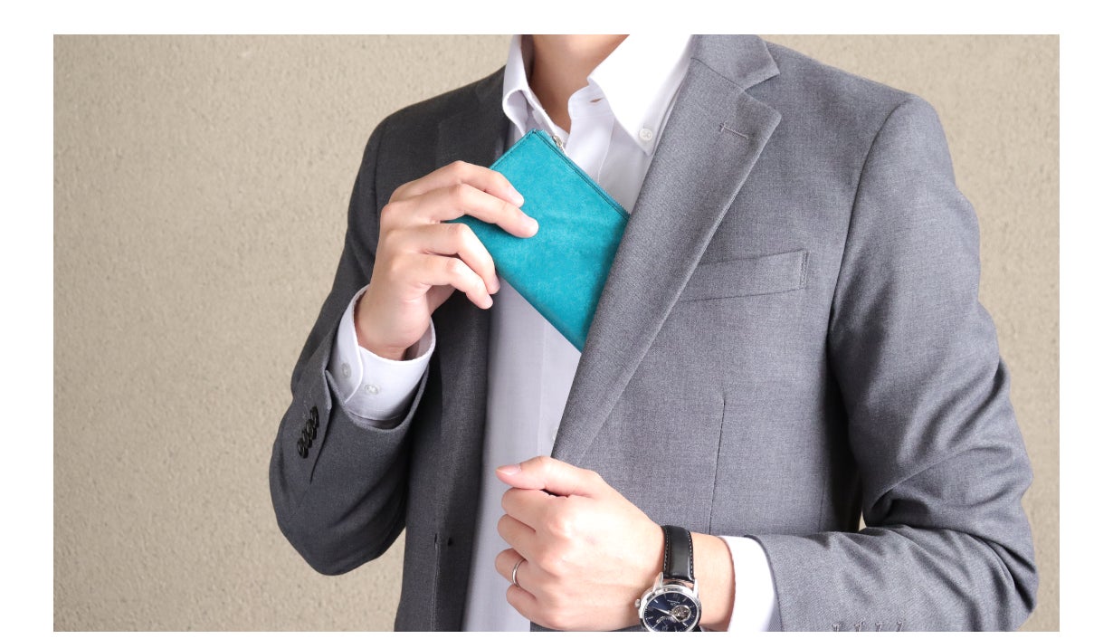 たっぷり収納しても厚みが変わらないため、ポケットに入れてもスーツのスタイルを崩しません。