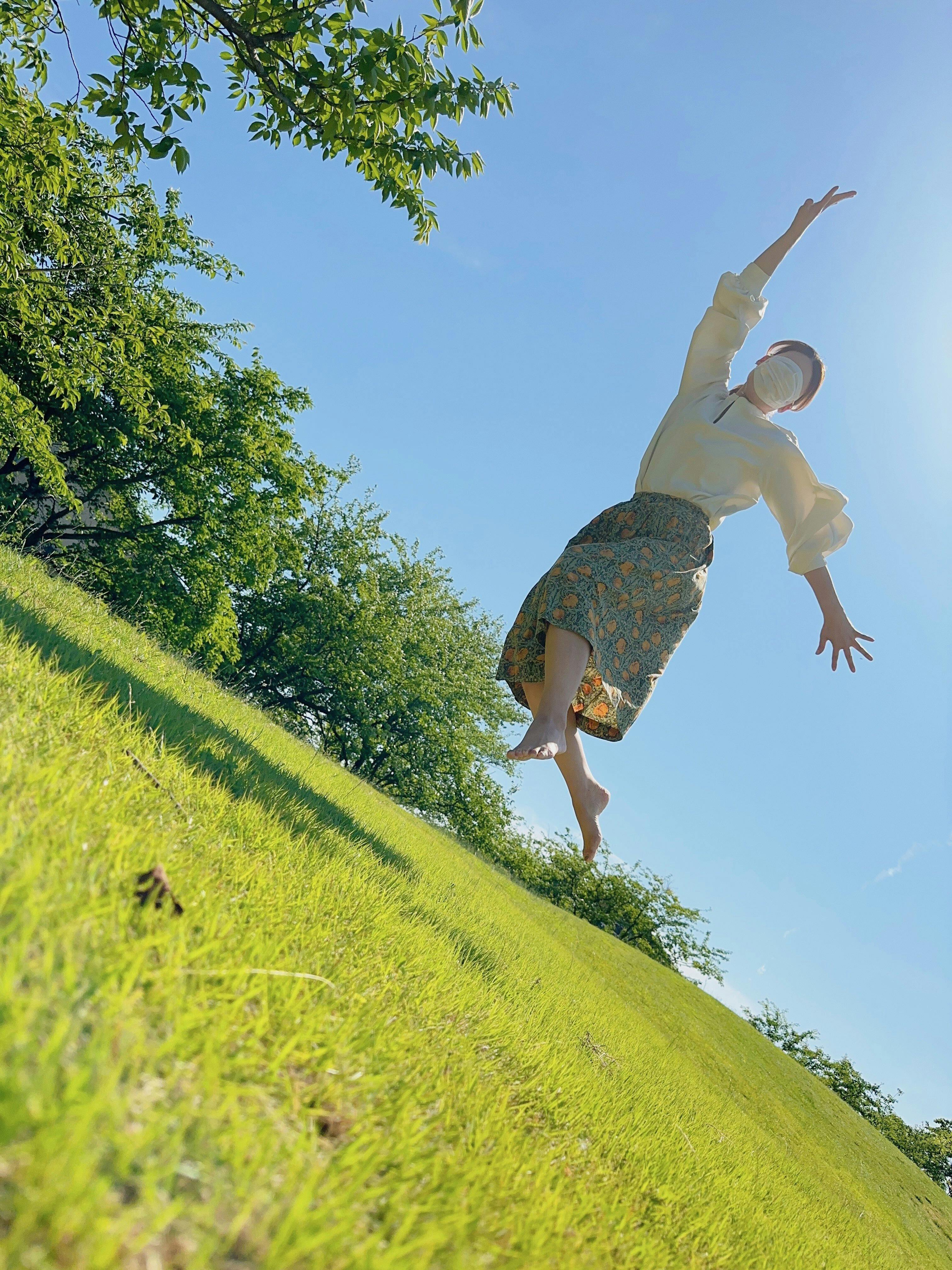 いちじくの葉は手を思いっきり広げた時に5本の指がいっぱいに広がったような形をしています。そこから、トランポリンを跳びながら、手を広げていっぱいに伸ばしている姿がピッタリとはまり、のトニック®️いちじくのモチーフになりました。