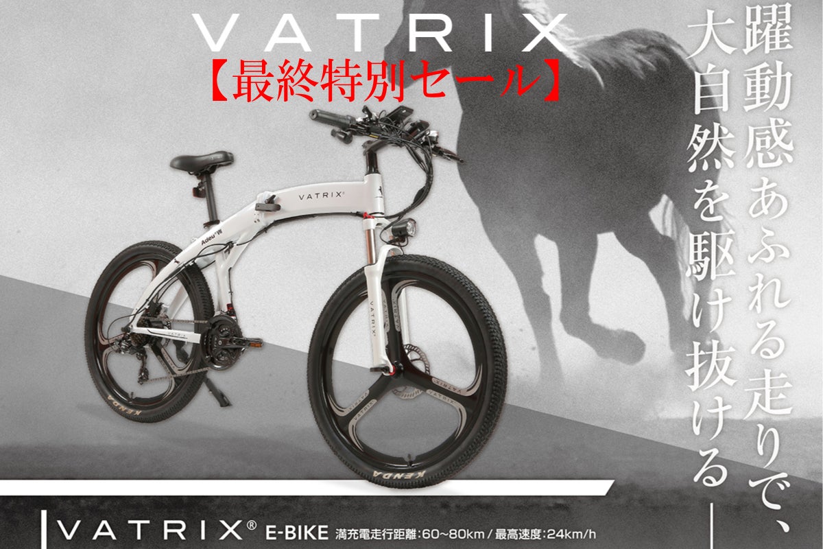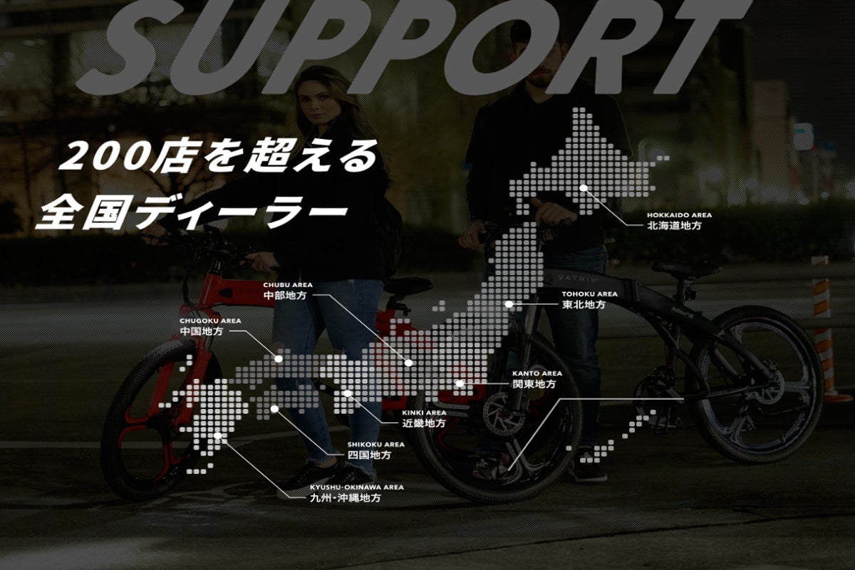 全国に200店のディーラーを構えるVATRIXは、スタイル・速さ、そして高級 スポーツカーを連想させる電動アシスト機能を搭載したマウンテンバイクです。 折り畳み式で60km走行可能な大容量バッテリーが、街乗りもアウトドアも快適な走行を実現します。