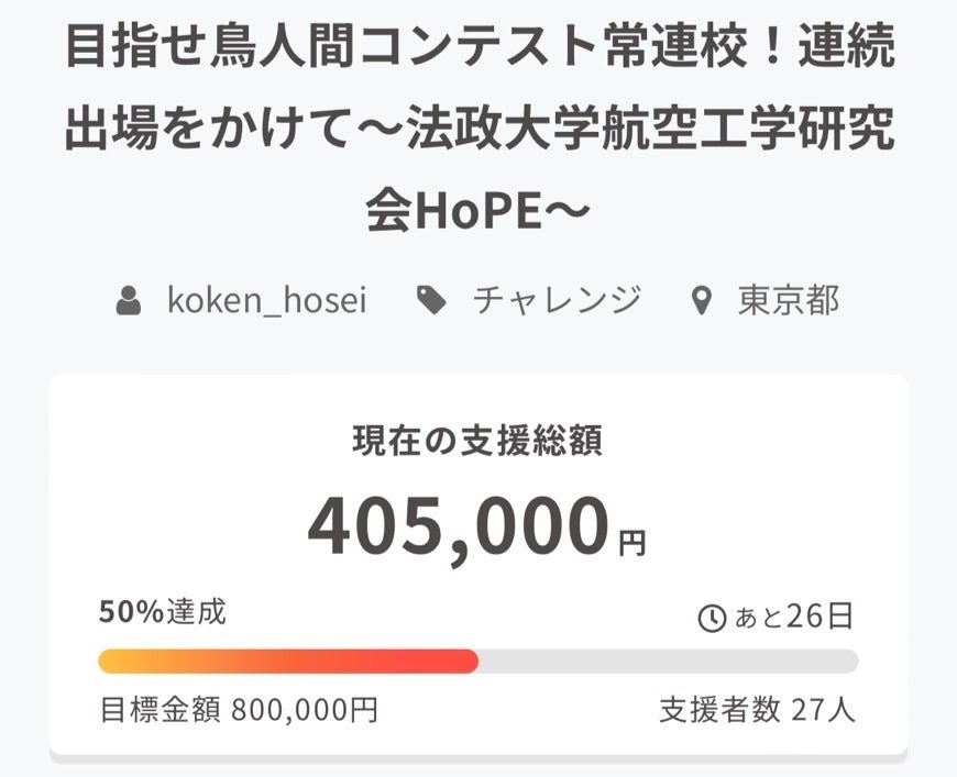 2023/10/21 17:48HoPEのクラウドファンディングが目標達成率50%を突破しました!応援していただいた皆様、心より感謝申し上げます。残り26日、引き継ぎ応援の程よろしくお願いいたします!目標達成率50%は、皆様のご支援のおかげで達成できた大きな節目です。しかし、まだまだ道半ばです。HoPEは、よりよい記録のために努力を続けていきます。そのためには、皆様のご協力が必要です。どうか、引き続きHoPEの活動にご注目ください。そして、ぜひ周りの方にもHoPEのことをお伝えください。HoPEは、皆様と一緒に、新たな記録を作ることができると信じています。最後まで応援よろしくお願いいたします!(広報A) もっと見る