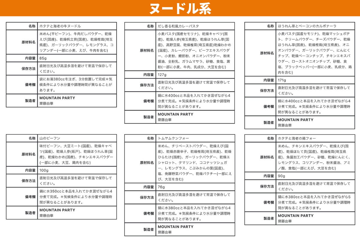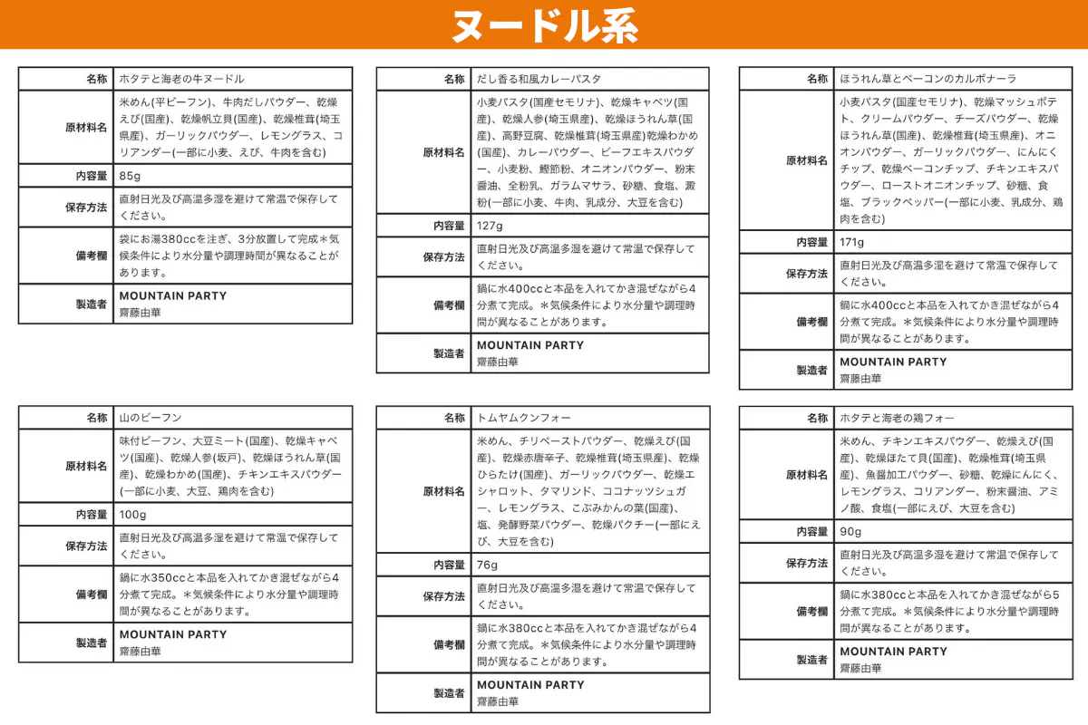 各商品の原材料/食品表示は以下の通りです。
