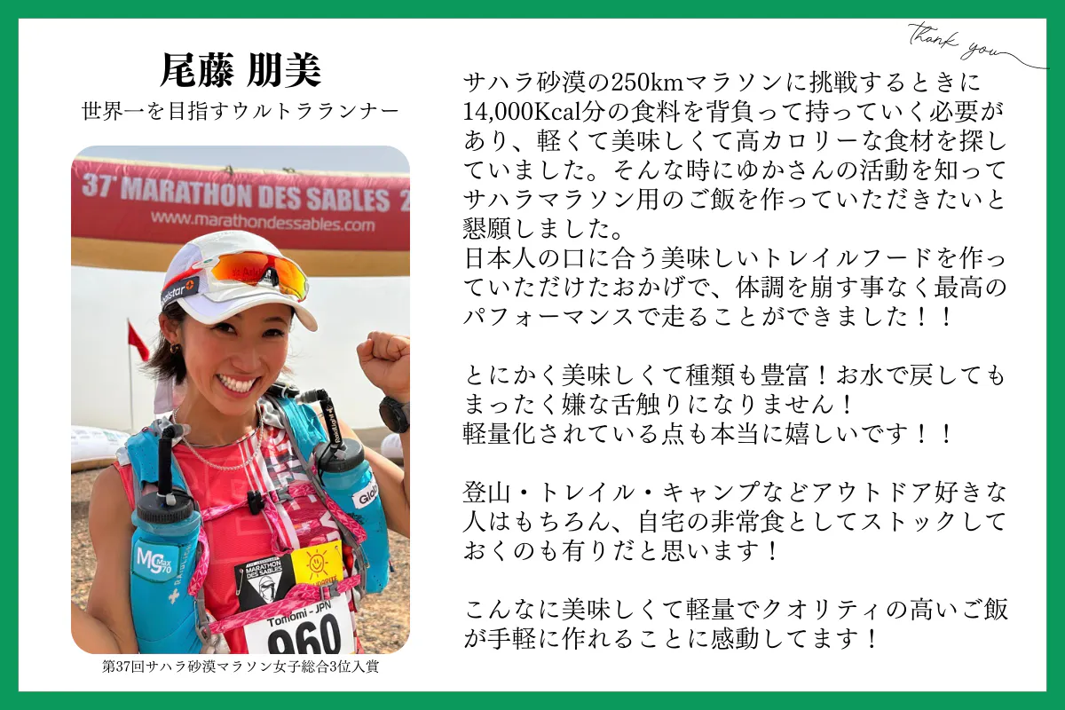 レース後には、感想として「気温52度の過酷な環境でも品質が変わることなく、十分なカロリーを美味しいご飯で摂取できたことで毎日元気に走れました」という嬉しい言葉もいただいています。
