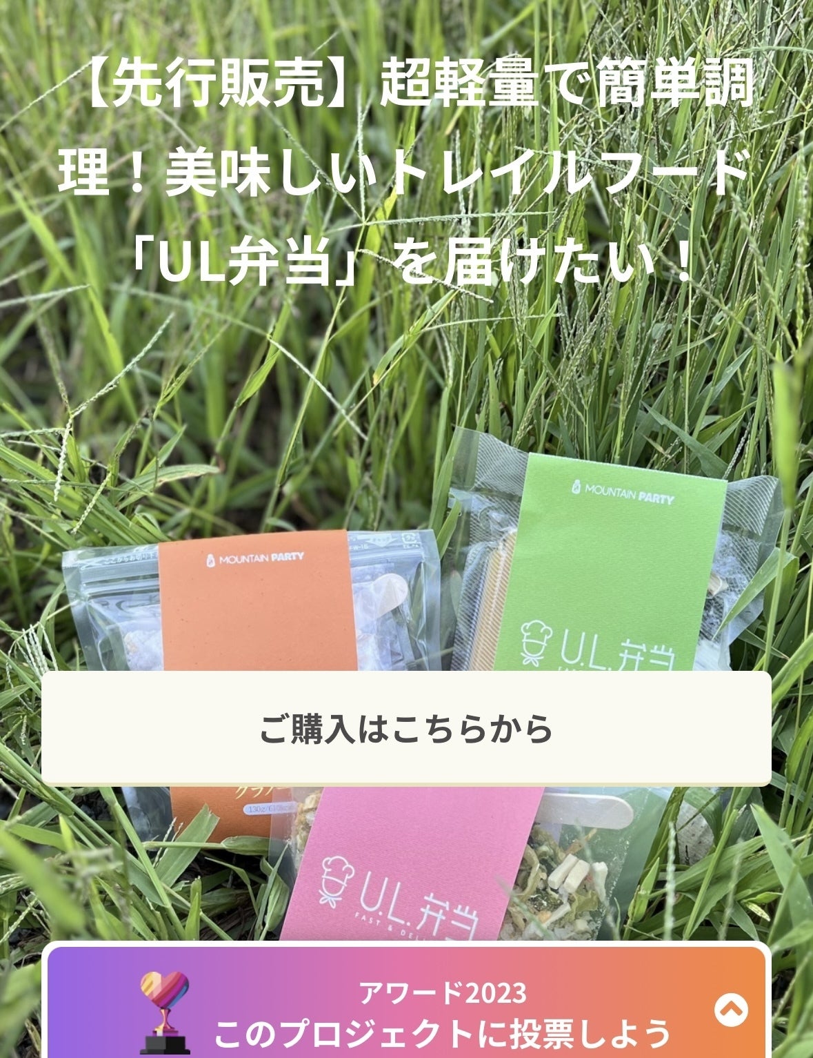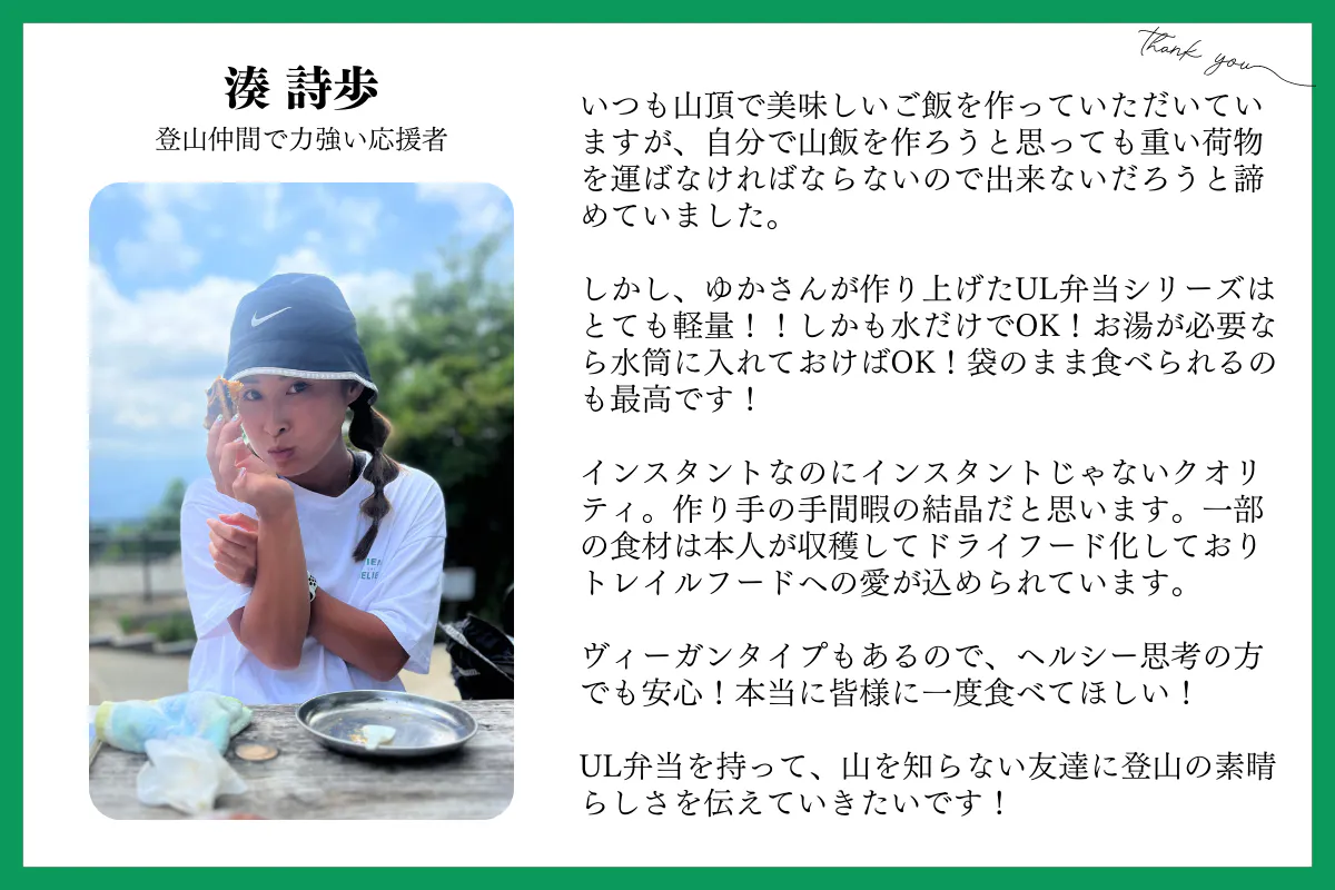 また、目標金額を超えた金額については、今後のトレイルフード商品『UL弁当』をシリーズ展開していくための費用に充てさせていただく予定です。