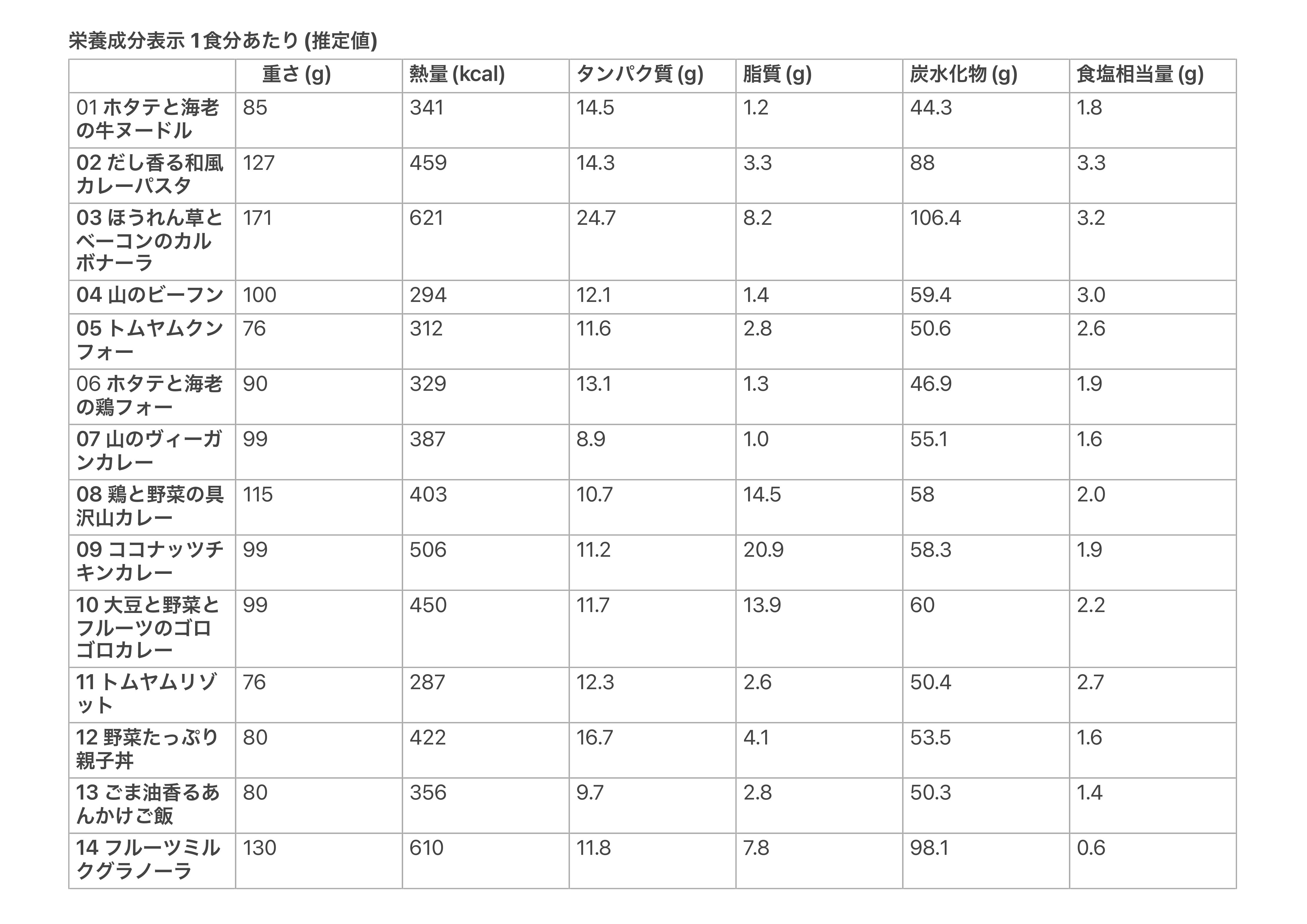 推定値にはなりますが各商品の栄養成分表示を一覧表にまとめています。