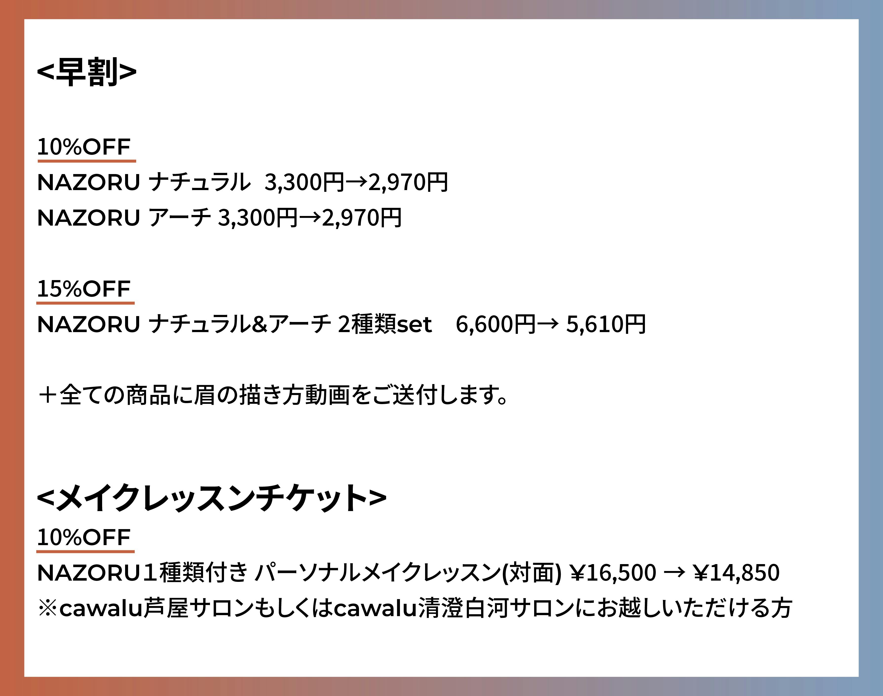 早割、メイクレッスンチケットに加え、リーズナブルに「NAZORU」が手に入るサンプルプランもご用意しました。