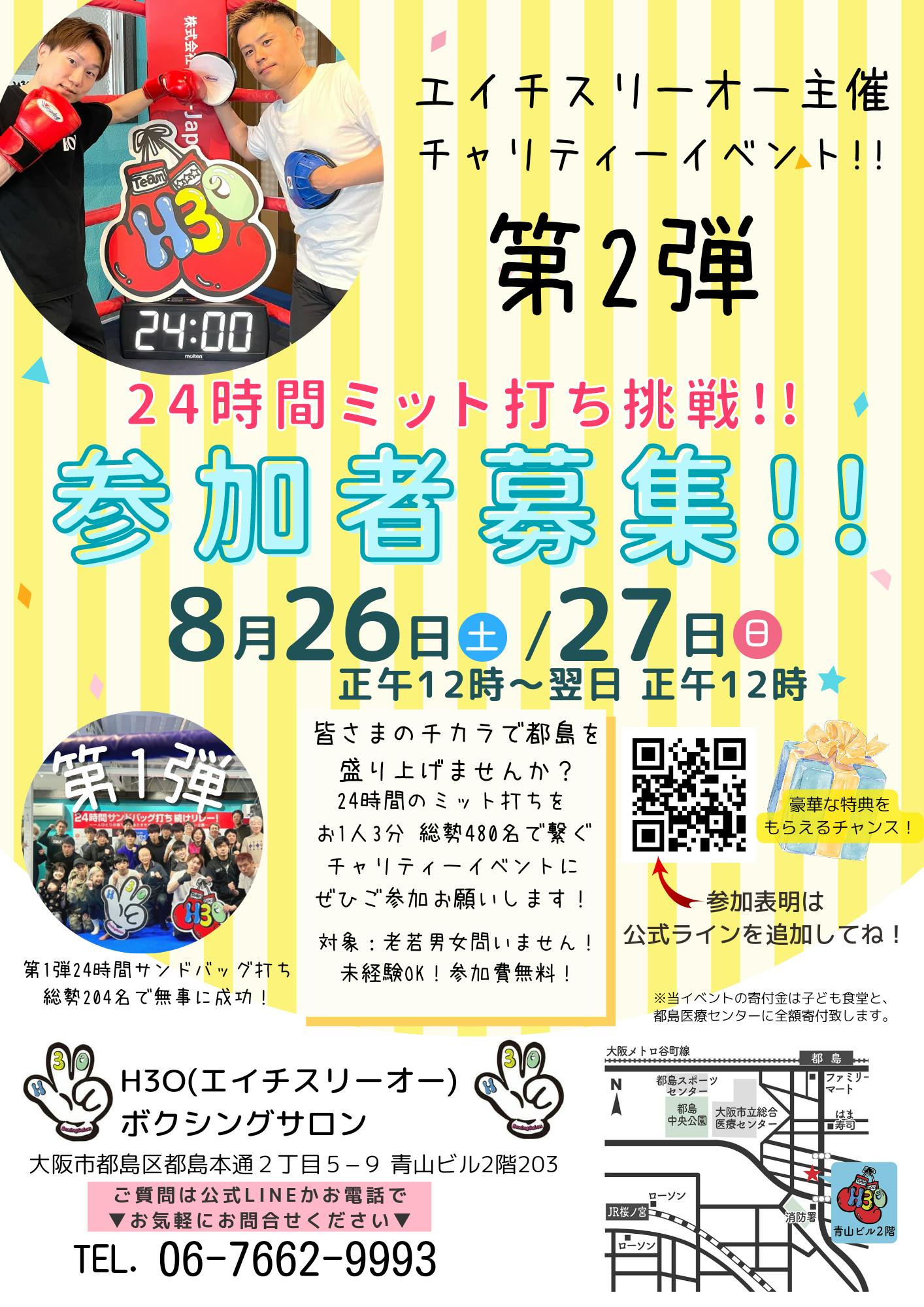 開催日は8月11日(金) 12時~ 8月12日(土) 12時、(←設備トラブルにより8月26日開催に変更になりました)8月26日(土)12時~8月27日(日)12時、場所は、ここ大阪都島のH3Oボクシングサロンです。