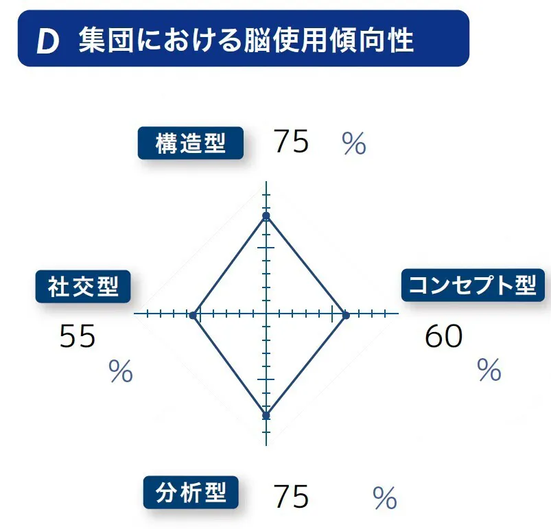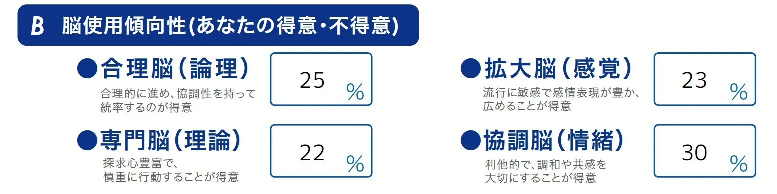 合理脳・拡大脳・専門脳・協調脳の24%以上が「強み」です。組み合わせは15パターン。