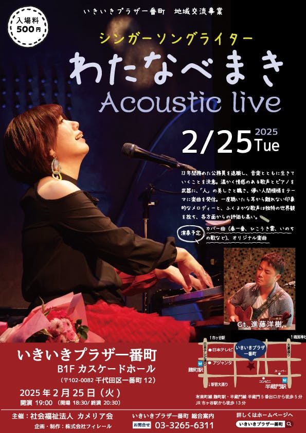 2025/01/25 13:24こんにちは!わたなべまきです。セカンドアルバム「体温」製作にあたりましては、皆様からの熱いご支援を賜りましたこと、改めて感謝申しげます。さて、あれから1年が経ちましたが、この度、わたなべまきのホールコンサートが開催される運びとなりました。これまでライブハウスでお届けすることが多かった私にとって、大きな挑戦となります。ぜひ、ホールに響く上質なサウンド、そして心を込めてお届けする歌声をご堪能いただけたらと思います。チケットは、なんと破格の500円です!どうぞ、お知り合いの方もお誘いいただきまして、ご来場いただけますと幸いです。・わたなべまき Acoustic live in カスケードホール2025.2.25(火)開場18:30/開演19:00前売/当日 500円出演:わたなべまき、進藤洋樹(Guitar)会場:カスケードホール〒102-0082 東京都千代田区一番町12 東京メトロ有楽町線「麹町」駅 5・6番出口 徒歩5分 東京メトロ半蔵門線「半蔵門」駅 5番出口 徒歩5分 JR/東京メトロ有楽町線・南北線・都営新宿線 「市ヶ谷駅」徒歩13分※全席自由※ご入場は整列順です。・チケット前売販売https://watanabemaki.thebase.in/items/96205551・チケット取り置き予約watamaki.staff@gmail.com へ、件名を「2/25」とし、本文に「ご予約氏名」と「人数」をお願いいたします。 もっと見る